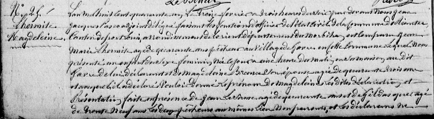 | Elle voit le jour à Belz (56) 16/01/1747. Père : L'HERMITE Germain, Sosa 560, Matelot Naissance : Date : 02/02/1717 Lieu : Erdeven (56) Mère : DEOREZ (LE) Marie Julienne, Sosa 561 Naissance : Date : 24/02/1717 Lieu : Belz (56) Décès : Date : ../../1776 à plus de 58 ans. A sa naissance, ses père et mère étaient tous deux âgés de 29 ans. |