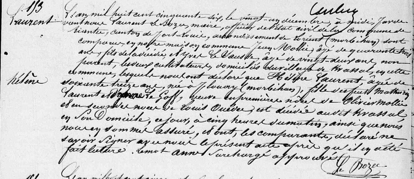 | 10. LAURENT Jeanne Naissance : Date : 26/03/1765 Lieu : Plouay (56), Locunel |
