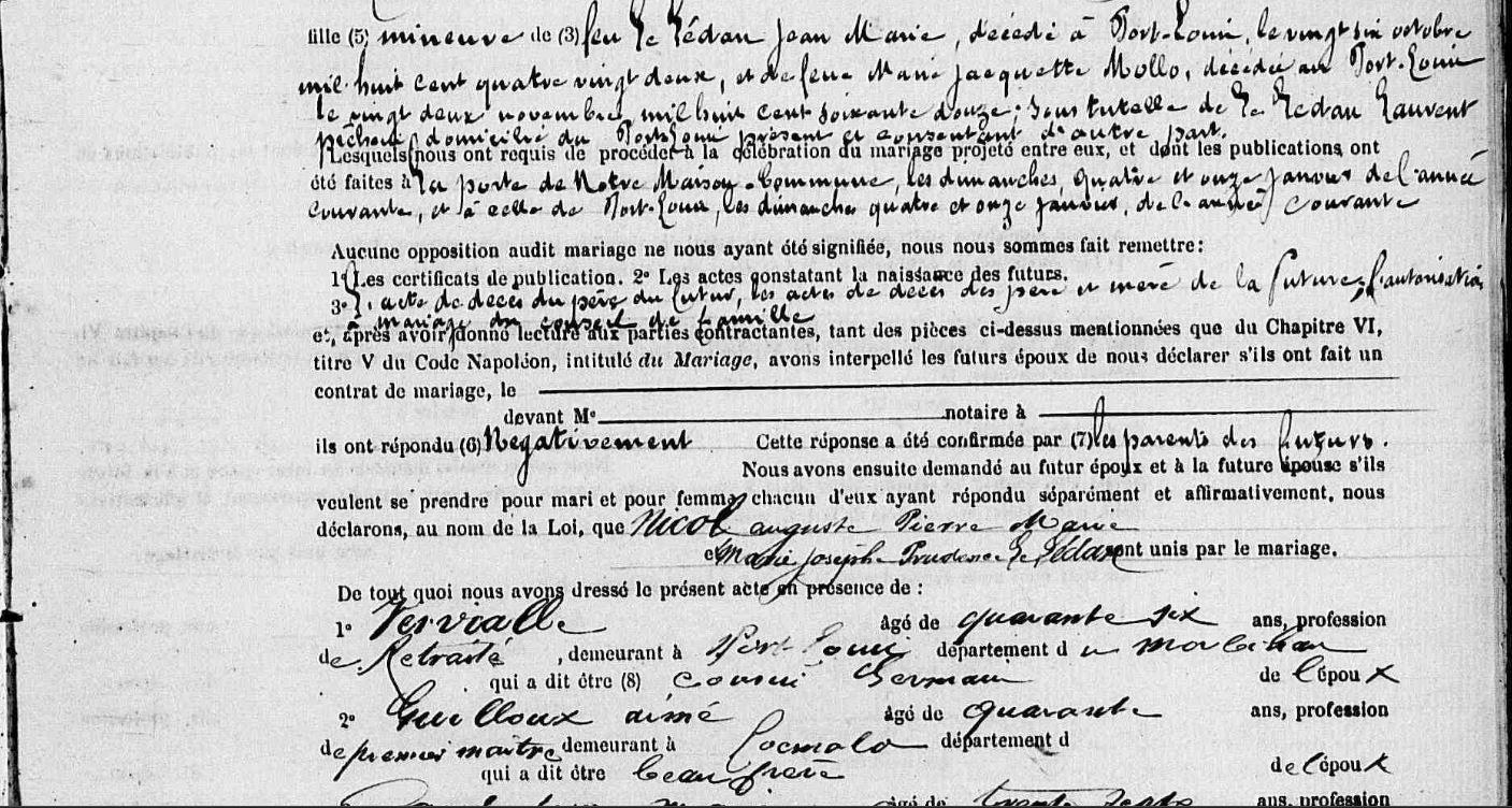 | Mariage : Date : 20/01/1885 Lieu : Riantec (56) NICOL Auguste Pierre Marie, Boucher - Charcutier Il est né à Port-Louis (56), Rue de la Pointe 21/08/1861. + 18/04/1899 Port-Louis (56), Hospice civil de la commune, 29 - - 11:00 - NO à l'âge de 37 ans. |