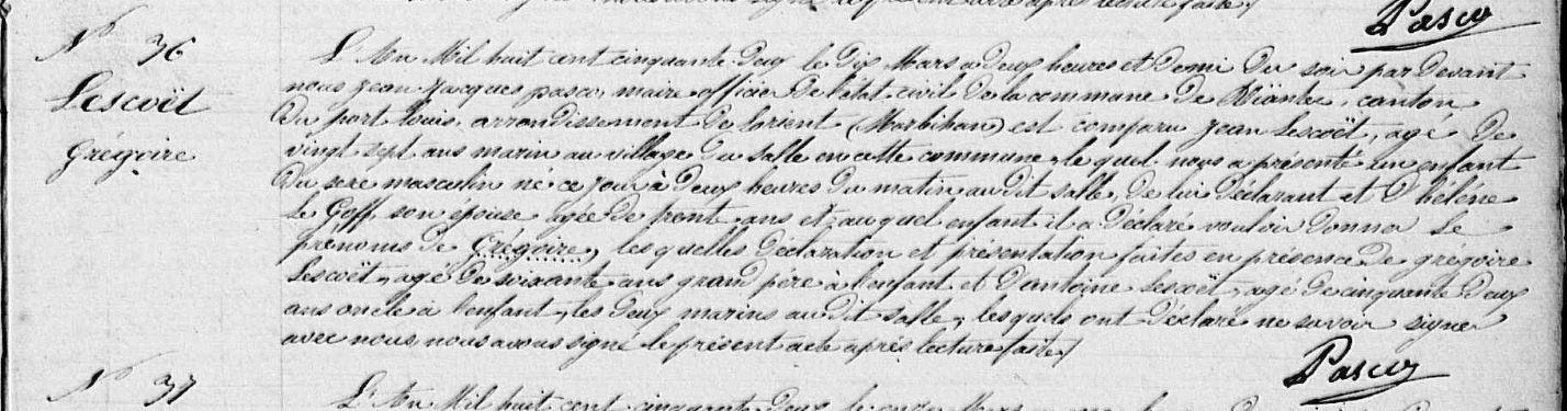 | Naissance LESCOET Grégoire - 1852 - Riantec |