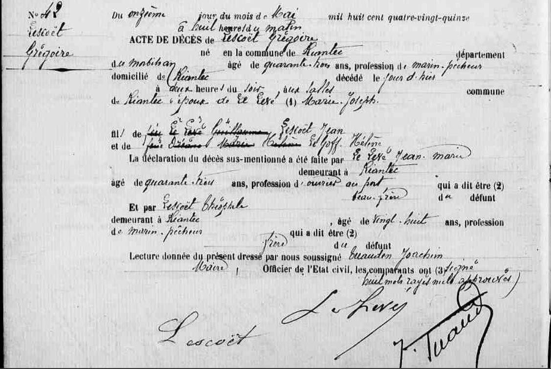 Décès LESCOET Grégoire - 1895 - Riantec |