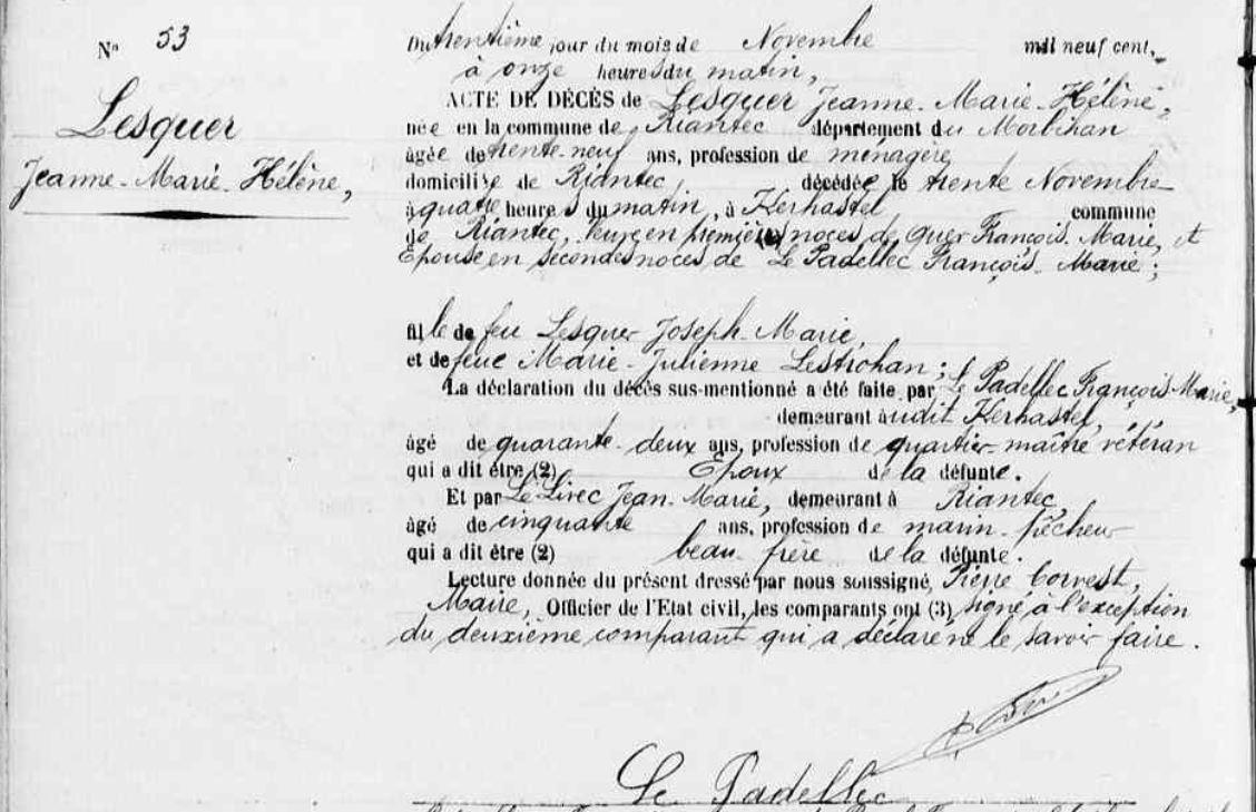 | 1. LESQUER Jeanne Marie Hélène Naissance : Date : 04/05/1861 Lieu : Riantec (56) Unie avec PADELLEC (LE) François Marie. Décès : Date : 30/11/1900 Lieu : Riantec (56), Kerastel à l'âge de 39 ans. |