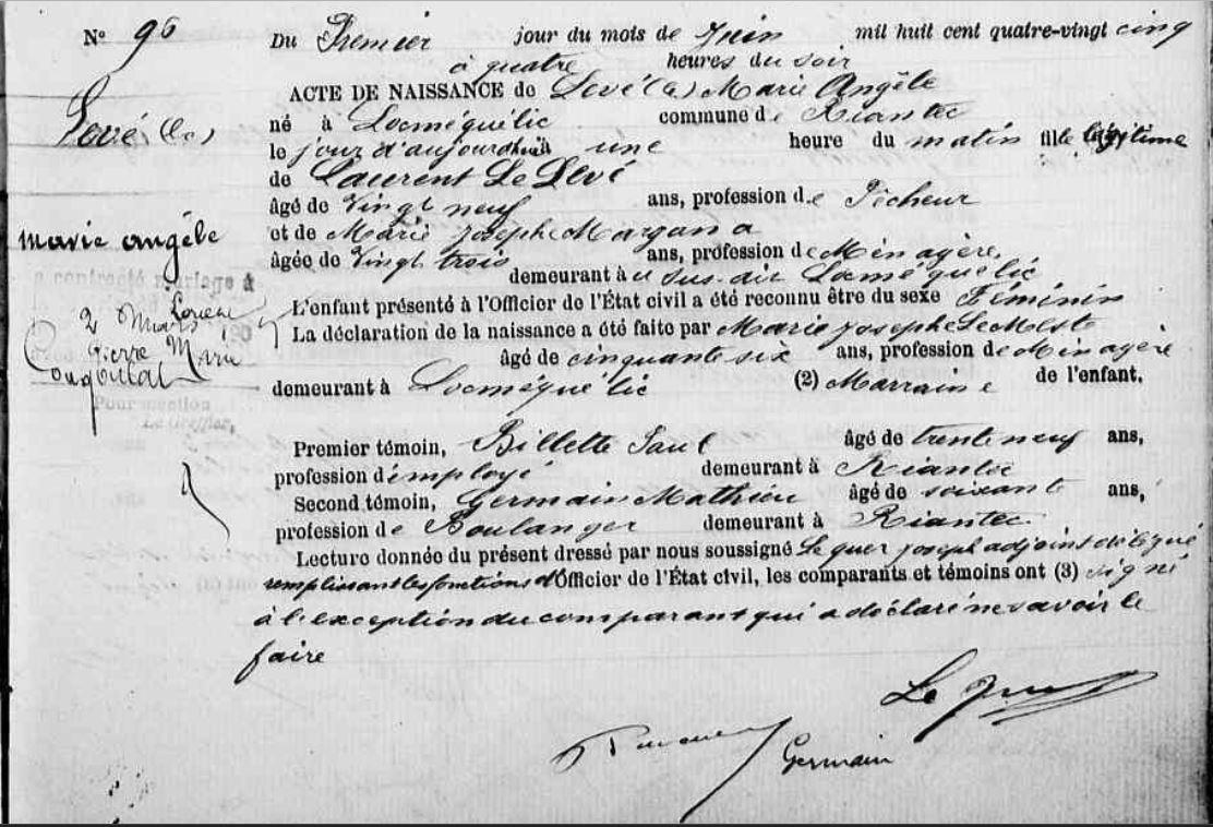 | Naissance LEVE (LE) Marie Angèle - 1885 - Riantec |