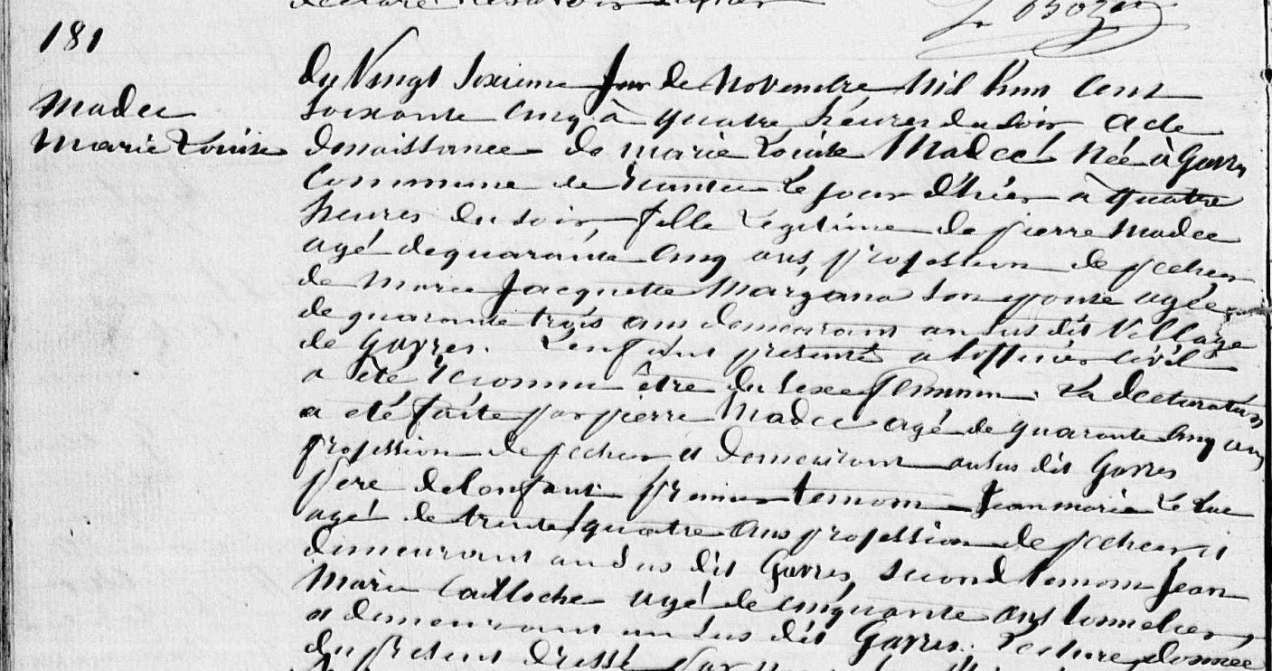 | Elle est née 25/11/1865 à Riantec (56), Gâvres. Père : MADEC Pierre, Marin pêcheur Naissance : Date : 10/11/1820 Lieu : Riantec (56), Gâvres Mère : MARGANA Jacquette, Sans profession Naissance : Date : 19/07/1823 Lieu : Riantec (56), Bourg A sa naissance, ses père et mère étaient âgés de 45 ans et 42 ans. |