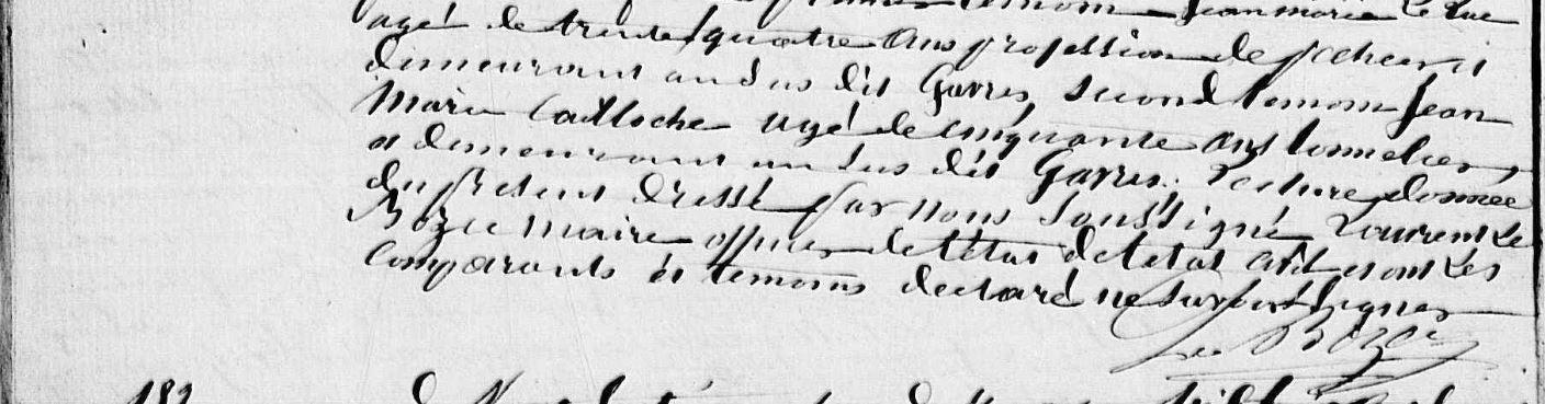 | Il naît ca ../../1687 . + 23/03/1767 Plouhinec (56), Lézévry, - - - NO à environ 80 ans. Signature : Non. |