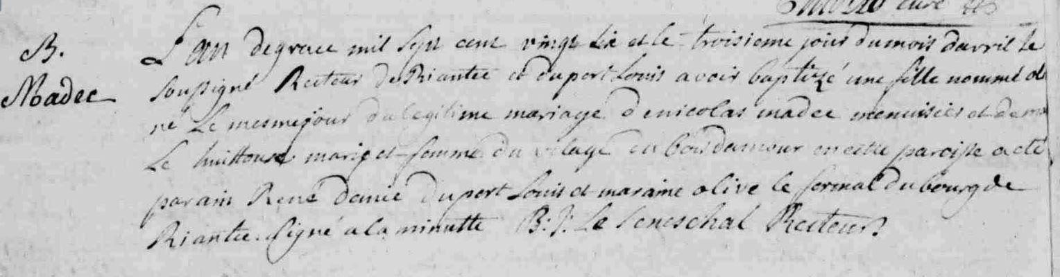 | 4. MADEC Olive Naissance : Date : 03/04/1726 Lieu : Riantec (56), Bois d'Amour |