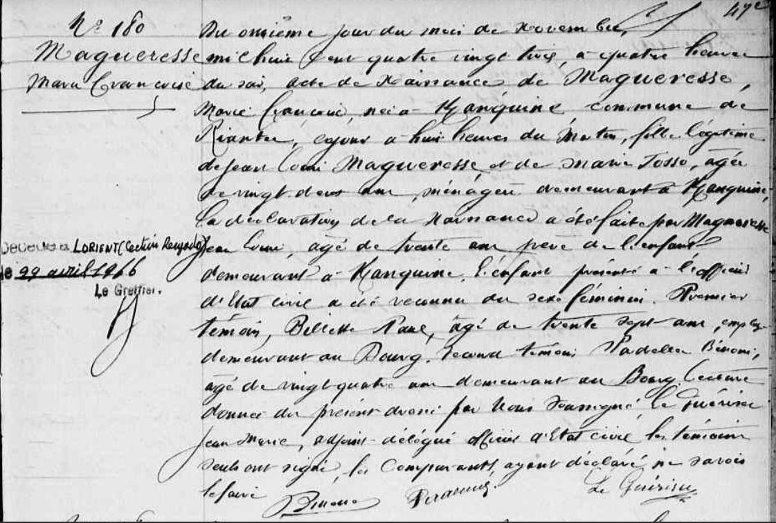 | Naissance MAGUERESSE Marie Françoise - 1883 - Riantec |