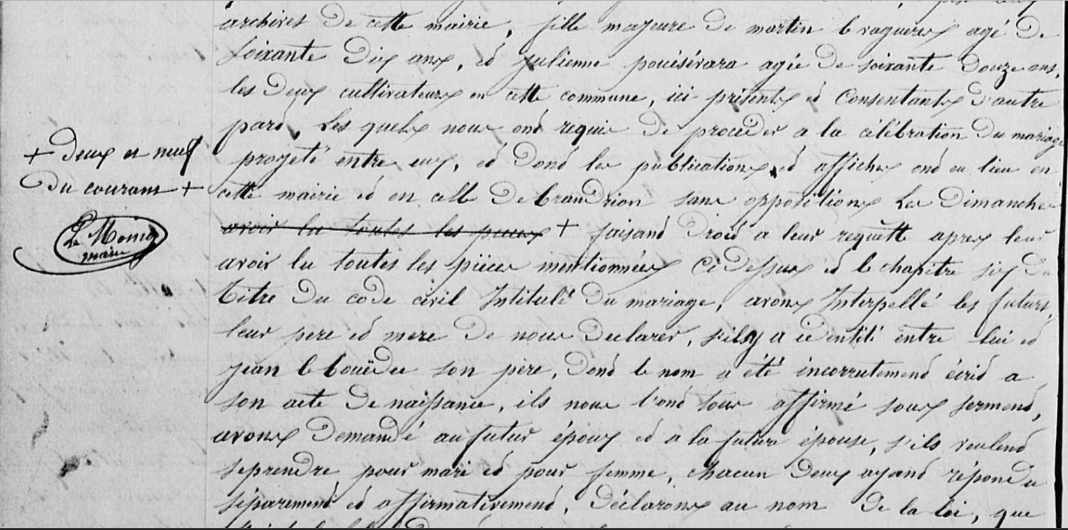 | 4 Note, Union : Michel LE BOUEDEC né a Caudan, et enregistré LE BOUDEC ainsi qu'il résulte de son acte de naissance ci amené ... ... avons interpellé les futurs, leur père et mère de nous déclarer s'il y a identité entre lui et Jean LE BOUEDEC son père, dont le nom a été incorrectement écrit à son acte de naissance, ils nous l'ont tous affirmé sous sermont, ... |