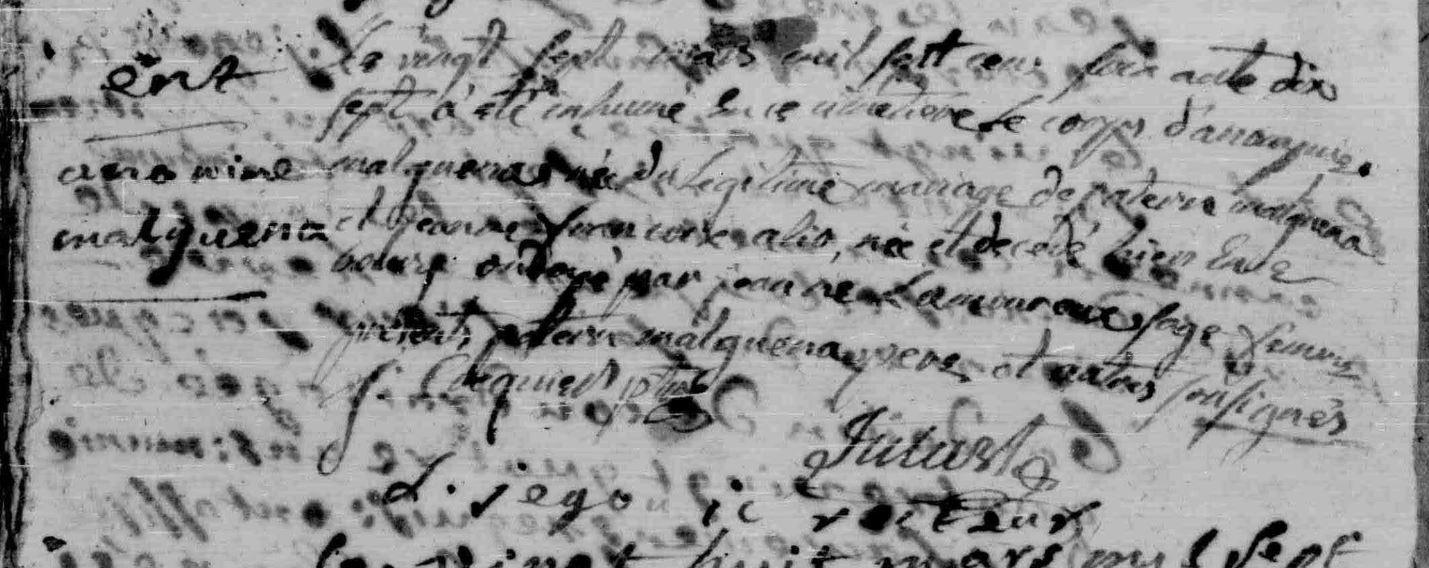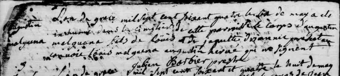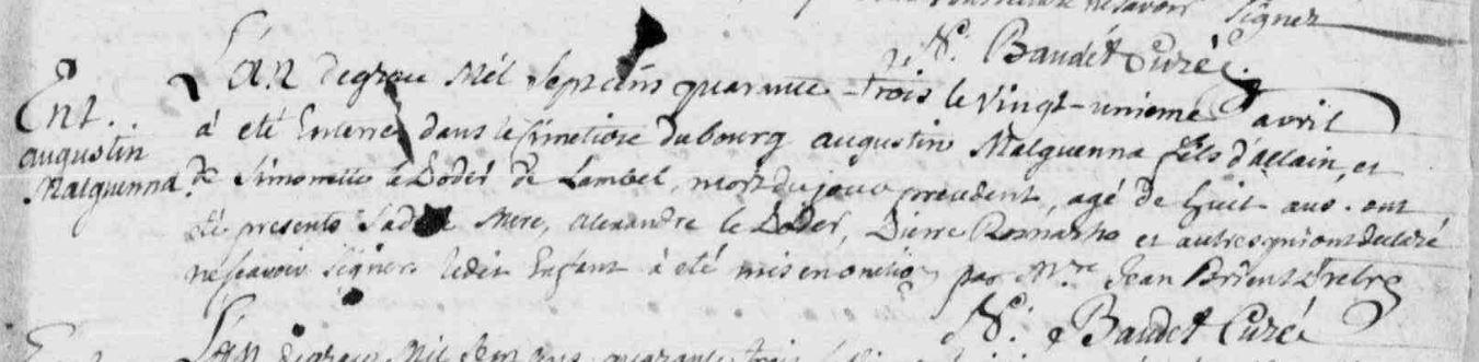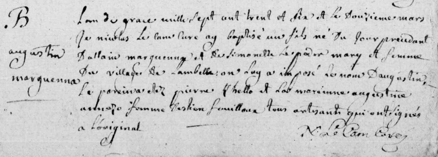 | Baptême MALGUENAC (MARGUENA) Augustin - 1736 - Camors |