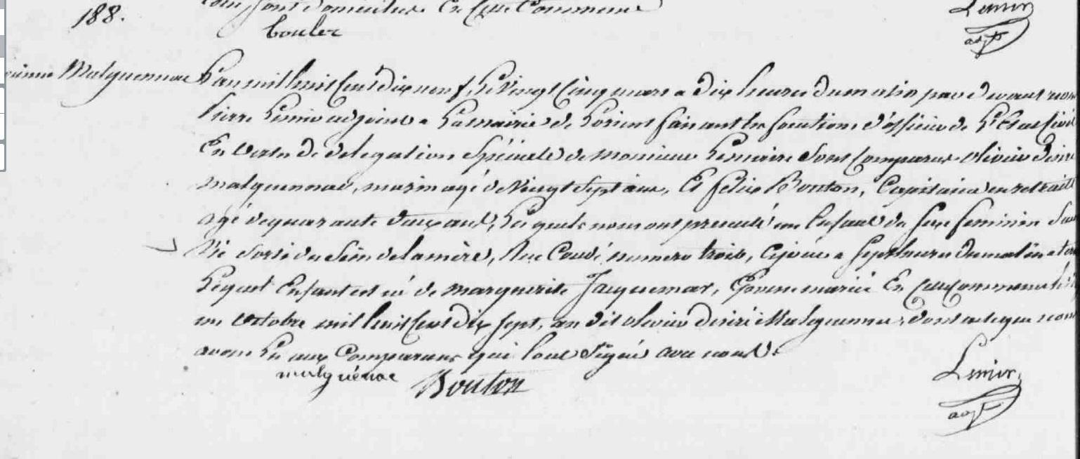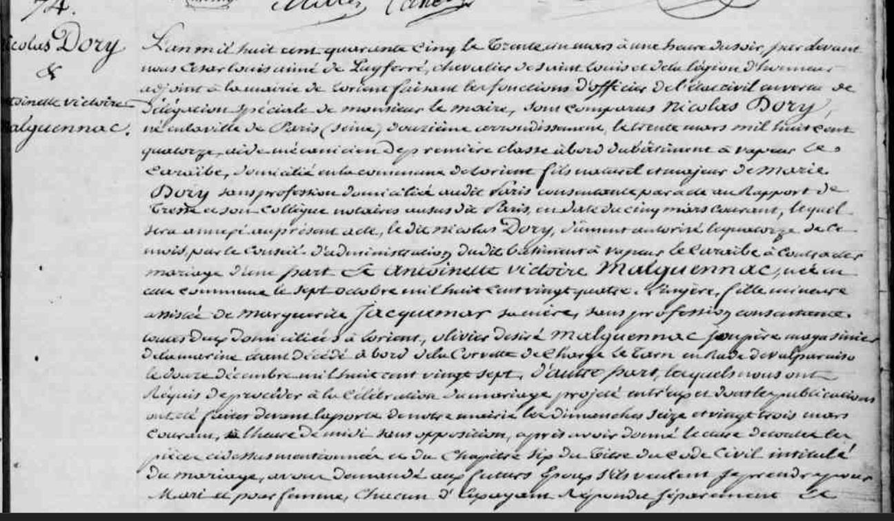 | Mariage 1 : Date : 31/03/1845 Lieu : Lorient (56) DORY Nicolas, Mécanicien à bord du bâtiment à vapeur "Le Caraïbe" Il est né à Paris (75), 12è arrondissement 30/03/1814. |