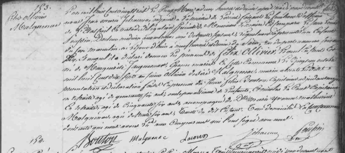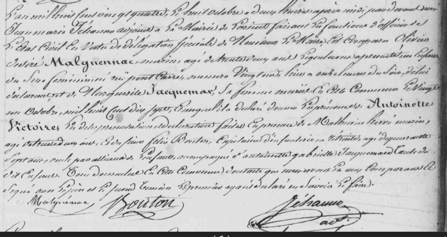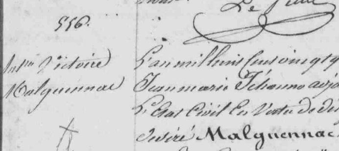 | - MALGUENAC Félix Ollivier (Naissance : 1823 Décès : 1850) Union 1849 : JAFFRÉ Anasthasie - MALGUENAC Antoinette Victoire (Naissance : 1824 Décès : 1865) Union 1845 : DORY Nicolas, Union : PEYROL Jacques |