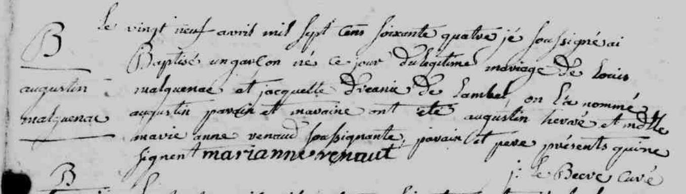 | Baptême MALGUENAC Augustin - 1764 - Baud |