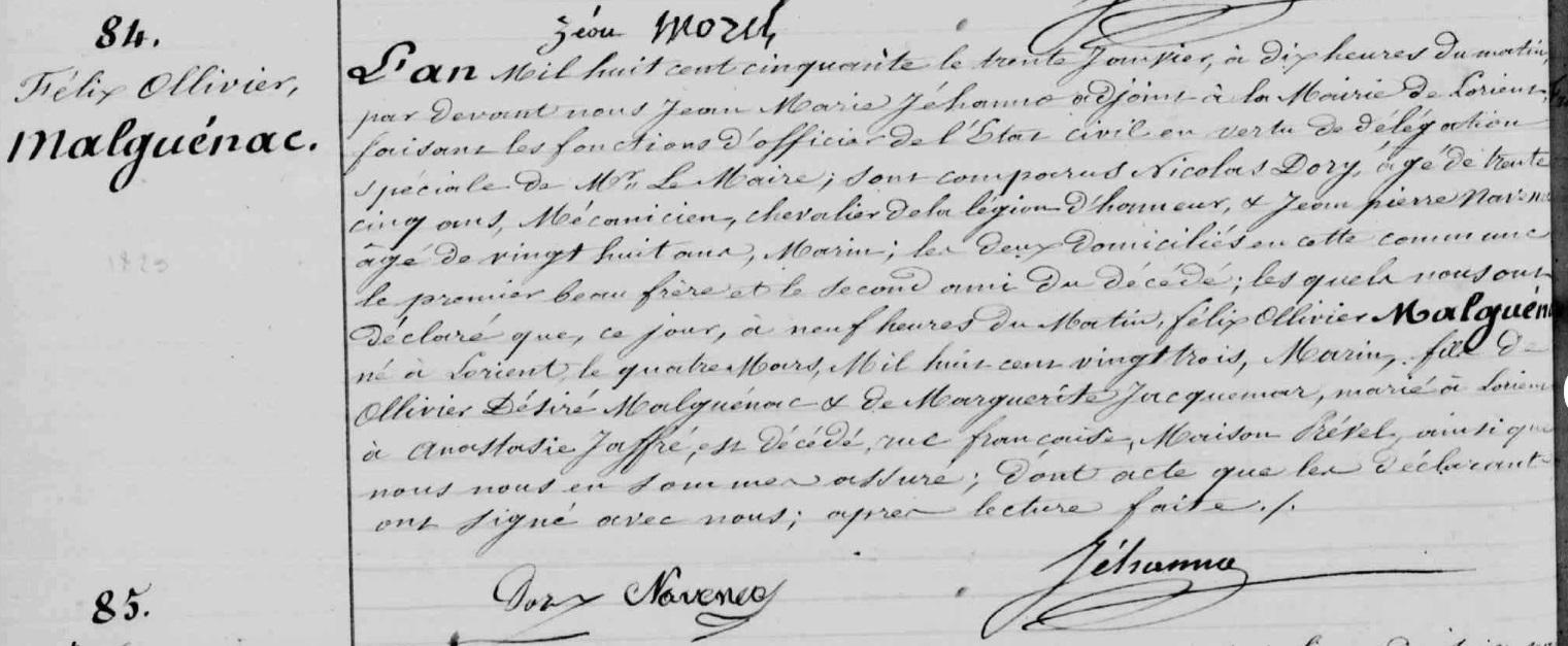 | Décès MALGUENAC Félix Ollivier - 1850 - Lorient |
