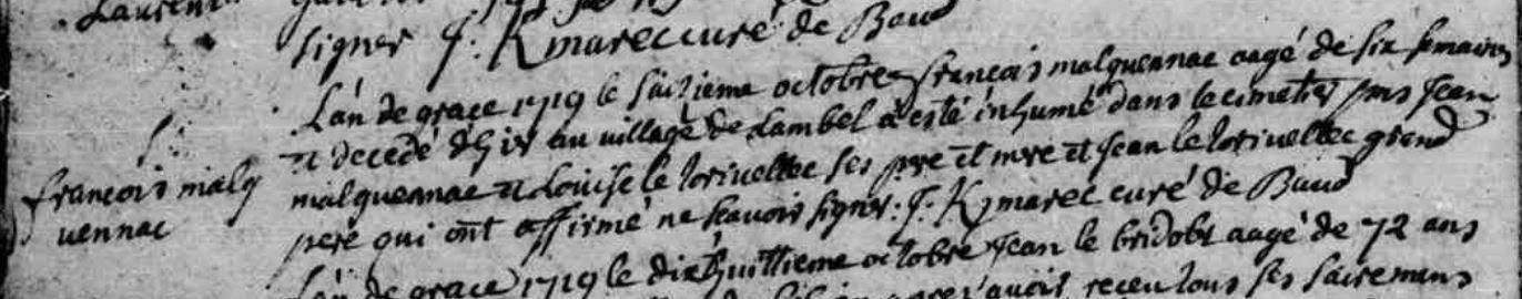 | Il naît à Baud (56), Lambel Scouzic 03/09/1719. Il est baptisé 04/09/1719 à Baud (56) à l'âge de 1 jour. + 15/10/1719 Baud (56), Lambel Baud, 6 semaines - - - NO à l'âge de 6 semaines. (+) 16/10/1719 Baud (56), 6 semaines - NO à l'âge de 6 semaines. Signature : Non. Père : MALGUENAC Jean Naissance : Date : 12/09/1690 Lieu : Baud (56), Lambel Baud Décès : Date : 24/07/1742 Lieu : Baud (56), Lambel Baud à l'âge de 51 ans. Mère : TORIELLEC (LE) Louise Naissance : Date : ../../1696 Décès : Date : 03/04/1767 Lieu : Baud (56), Lambel Gascogne à environ 71 ans. A sa naissance, ses père et mère étaient âgés de 28 ans et d'environ 23 ans. |