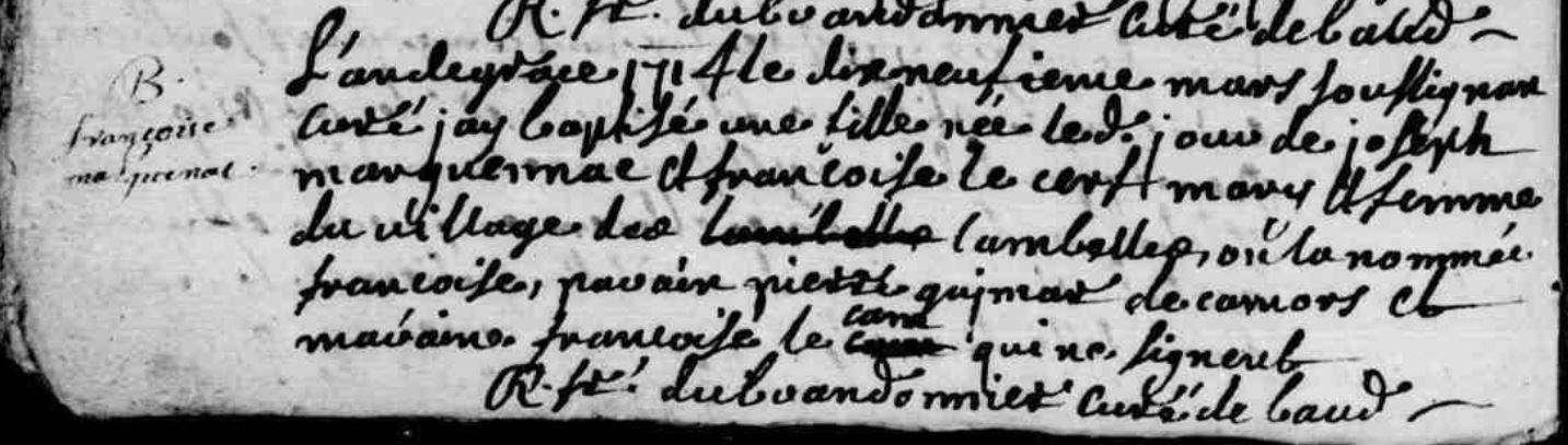 | 3. CAM (LE) Françoise Naissance : Date : 25/01/1744 Lieu : Camors (56), Lambel |
