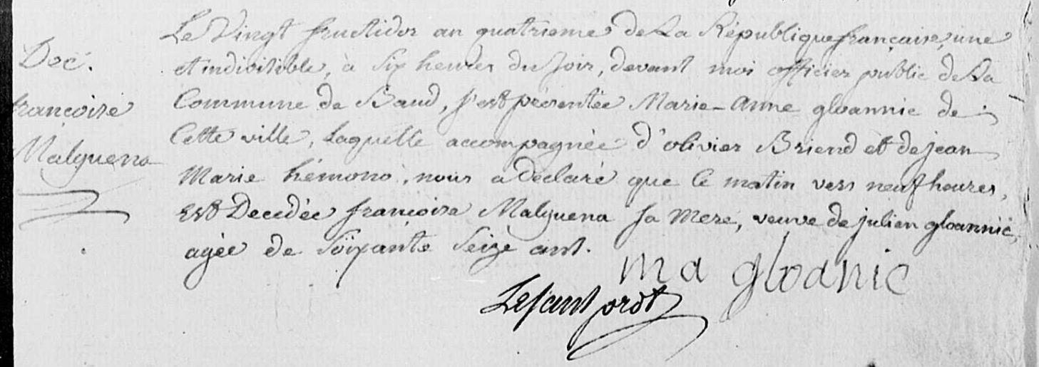 | 3. GLOANIC (LE) Marie Anne Naissance : Date : ../../1749 Décès : Date : 28/02/1810 Lieu : Baud (56) à environ 61 ans. |