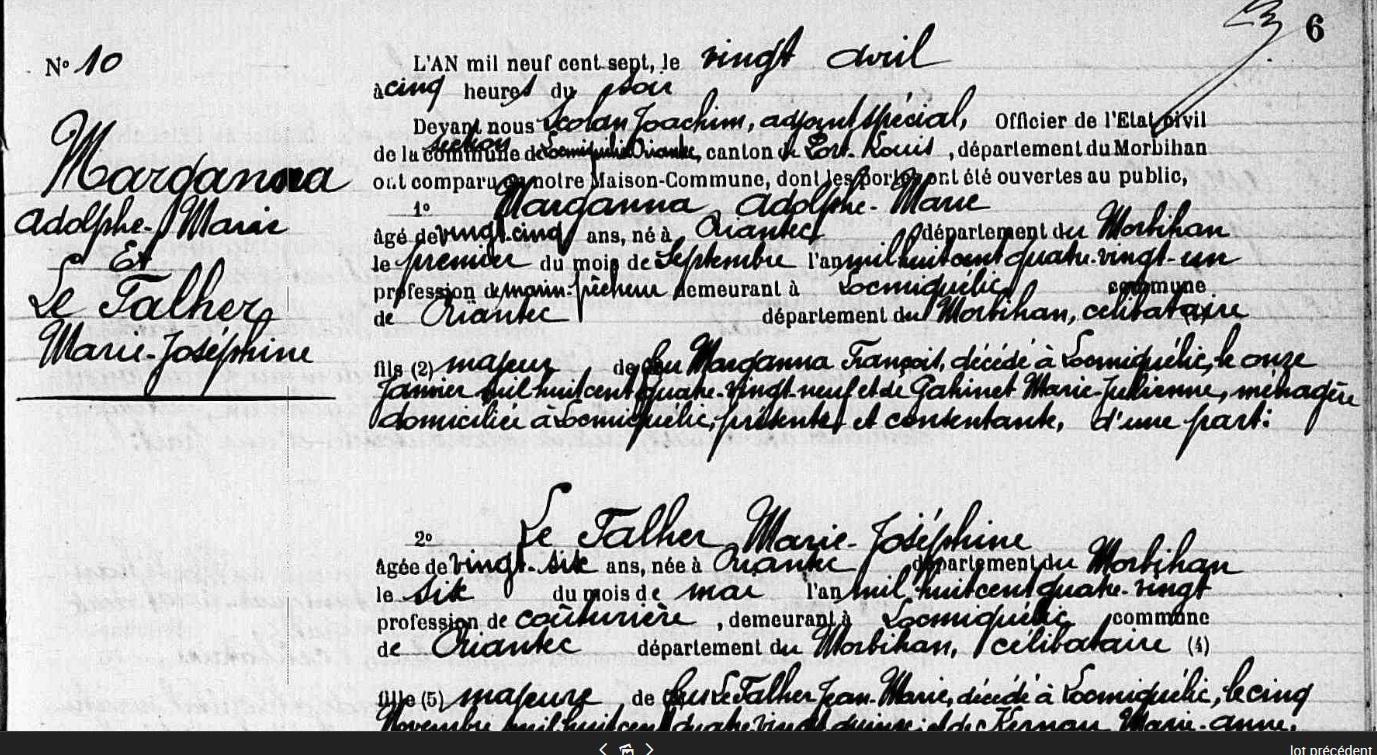Mariage MARGANA Adolphe Marie FALHER (LE) Marie Joséphine - 1907 - Locmiquélic - 1 |