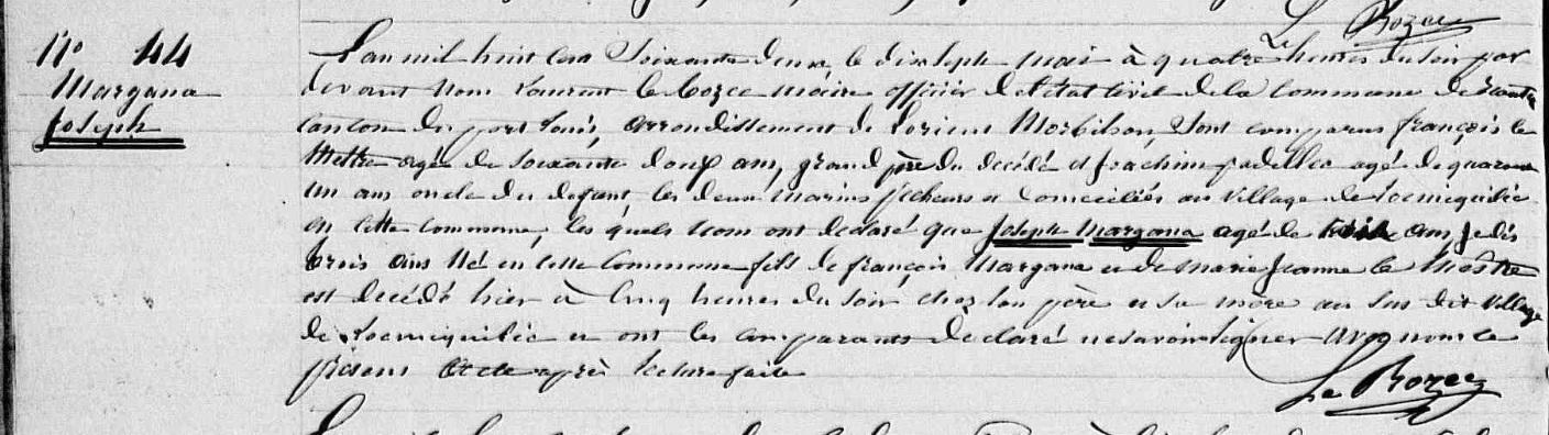 | Enfant(s) de MARIANNA (MARGANA) François et de BOULARD Hélène : - MARGANA Marie (Naissance : 1820 Décès : 1863) Union 1844 : BER (LE) Julien - MARGANA Marie Julienne (Naissance : 1822 Décès : 1882) Union 1844 : QUER Antoine - MARGANA Jacquette (Naissance : 1823) Union 1850 : MADEC Pierre - MARGANA Suzanne (Naissance : 1825 Décès : 1880) Union 1856 : PADELLEC (LE) Pierre - MARGANA Jeanne Françoise (Naissance : 1827 Décès : 1872) Union 1857 : NÉZET (LE) Joseph - MARGANA Charles Marie Désiré (Naissance : 1830 Décès : 1855) - MARGANA Marie Anne Cornélie (Naissance : 1832) |