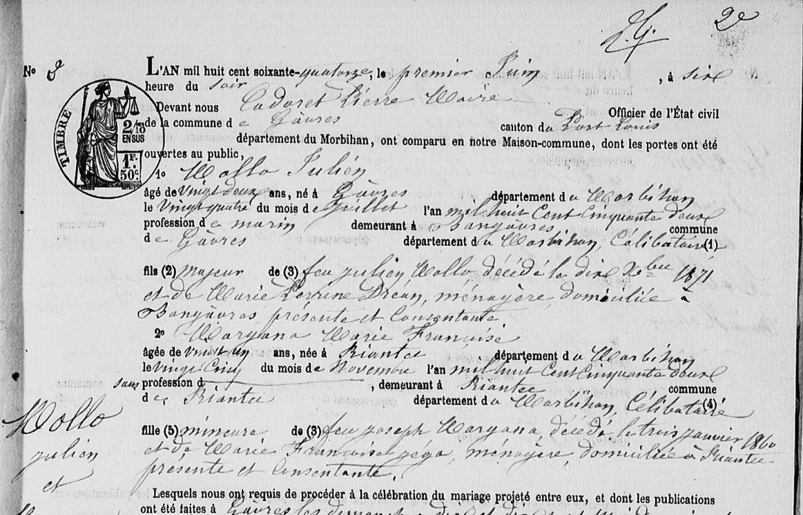 Mariage MOLLO Julien MARGANA Marie Françoise - 1874 - Gâvres - 1 |