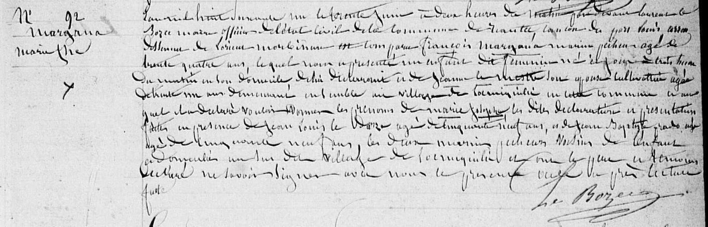| 1 Note, Naissance : Déclaration faite le lendemain à 10h00 par son père fiacre MARIENNA et ses deux témoins eux aussi du Bourg. |