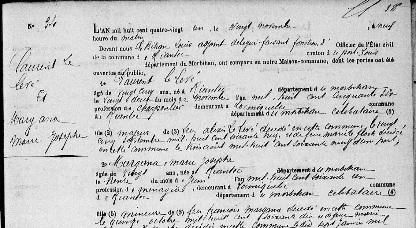 Mariage LEVE (LE) Laurent MARGANA Marie Josephe - 1881 - Riantec - 1 |
