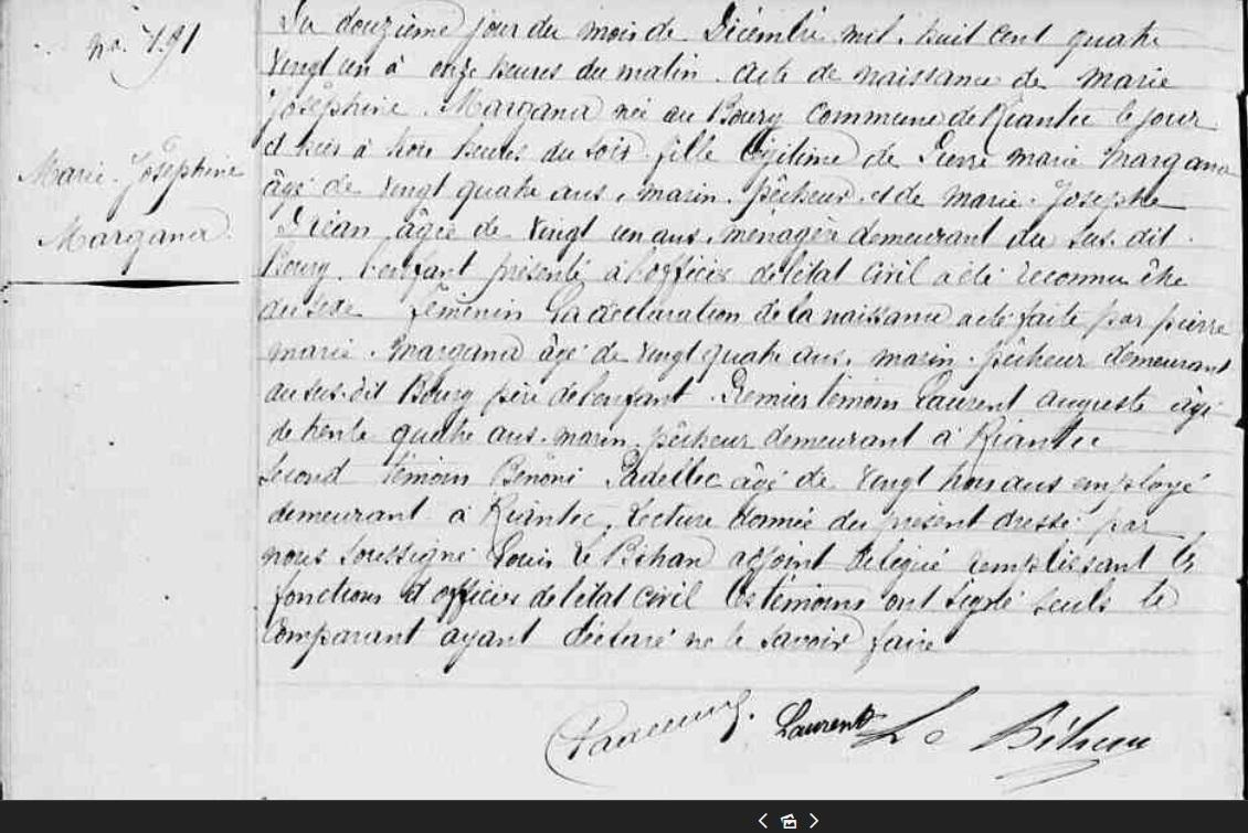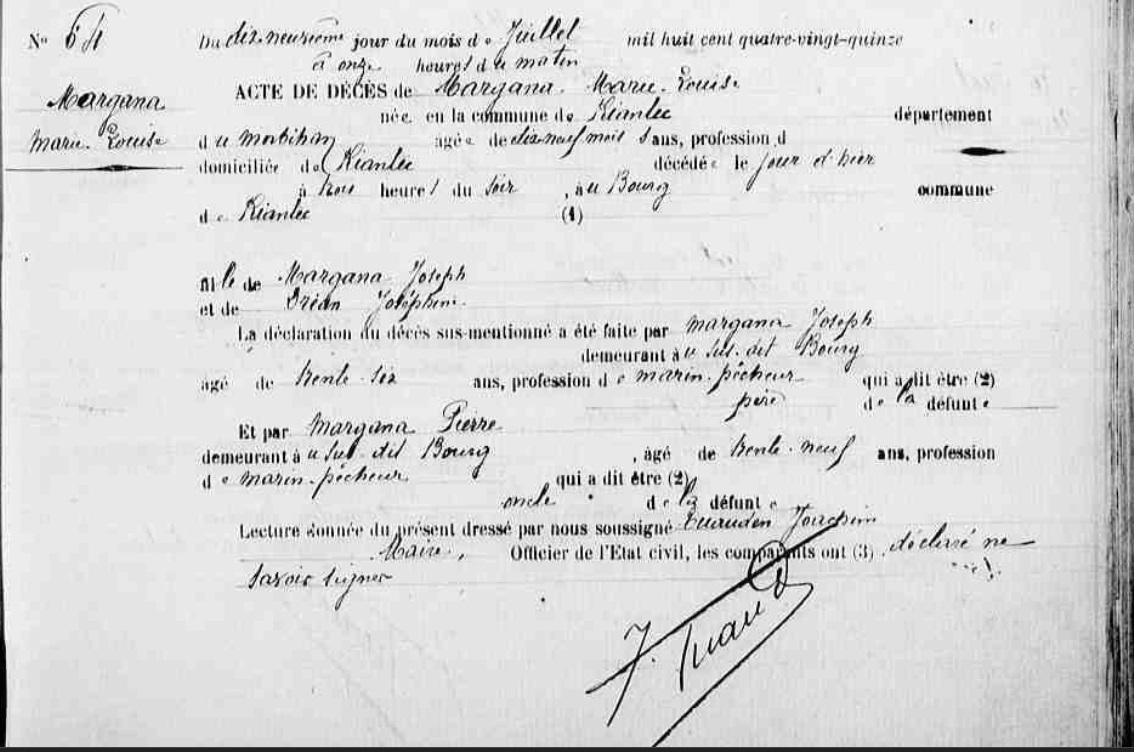 | Elle voit le jour à Riantec (56), Bourg 18/03/1837. + 05/06/1844 Riantec (56), Bourg, 7 ans - - 2:00 - NO à l'âge de 7 ans. Père : MARIENNA (MARGANA) Julien, Sosa 64, marin pêcheur Naissance : 1 Date : 15/02/1796 Lieu : Riantec (56), Bourg Décès : Date : 21/08/1859 Lieu : Riantec (56), Bourg à l'âge de 63 ans. Mère : GALLO (LE) Anne, Cultivatrice Naissance : Date : 12/08/1809 Lieu : Riantec (56), Les Salles Décès : Date : 25/07/1839 Lieu : Riantec (56), Bourg à l'âge de 29 ans. A sa naissance, ses père et mère étaient âgés de 41 ans et 27 ans. |