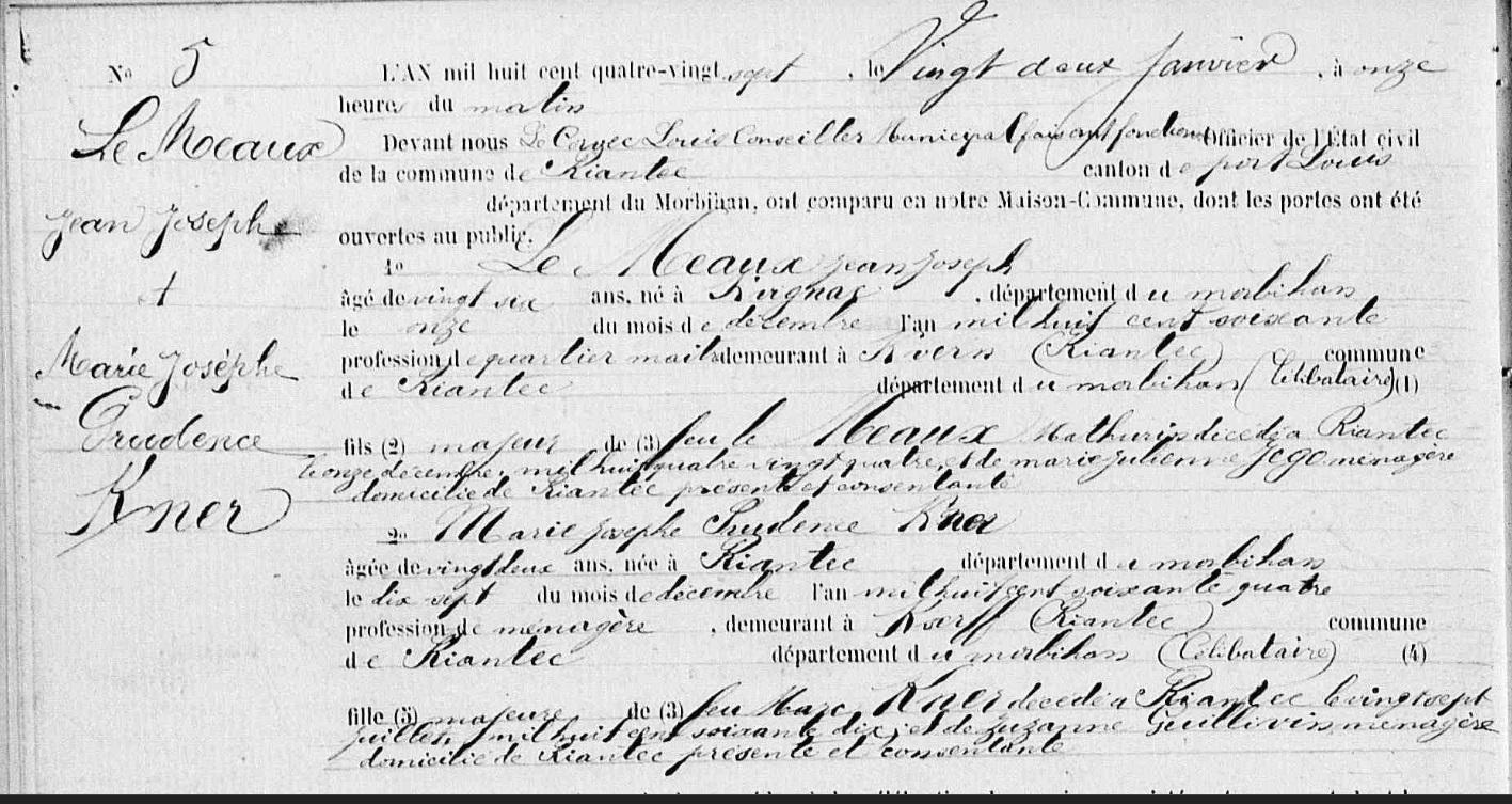 Mariage MEAUX (LE) Jean Joseph KERNER Marie Josephe Prudence - 1887 - Riantec - 1 |