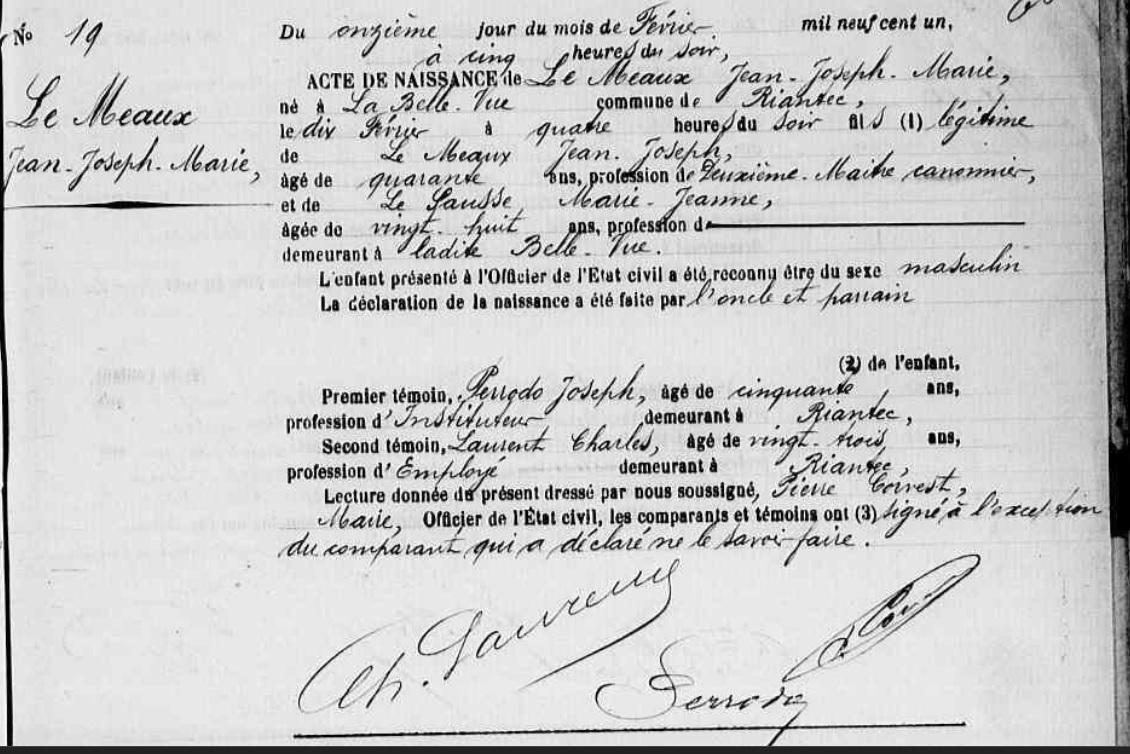 | Naissance MEAUX (LE) Jean Joseph Marie - 1901 - Riantec |