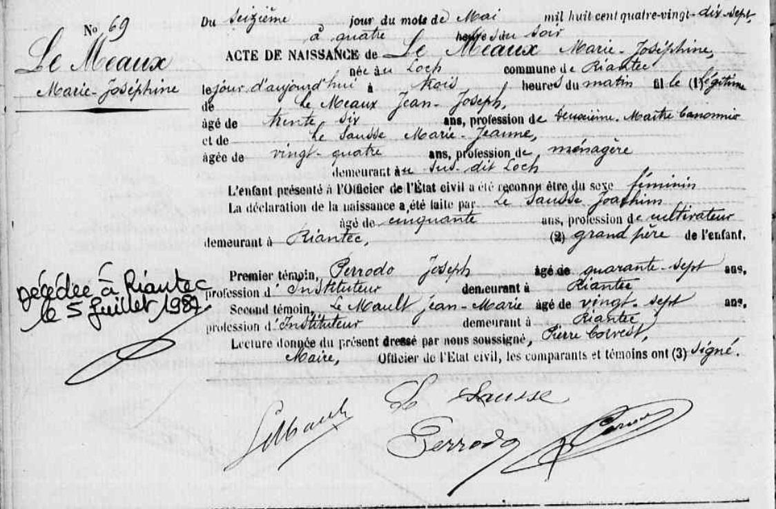 | Il naît 04/04/1850 à Kervignac (56), Talhouët. Signature : Y. Père : MEAUX (LE) Mathurin, Sosa 44, Cultivateur Naissance : Date : 15/09/1816 Lieu : Kervignac (56), Braigno Décès : Date : 10/12/1884 Lieu : Riantec (56) à l'âge de 68 ans. Mère : JEGO Marie Julienne, Sosa 45, Ménagère - Cultivatrice Naissance : Date : 11/11/1826 Lieu : Kervignac (56) Décès : Date : 10/02/1896 Lieu : Riantec (56), Kerverne à l'âge de 69 ans. A sa naissance, ses père et mère étaient âgés de 33 ans et 23 ans. |