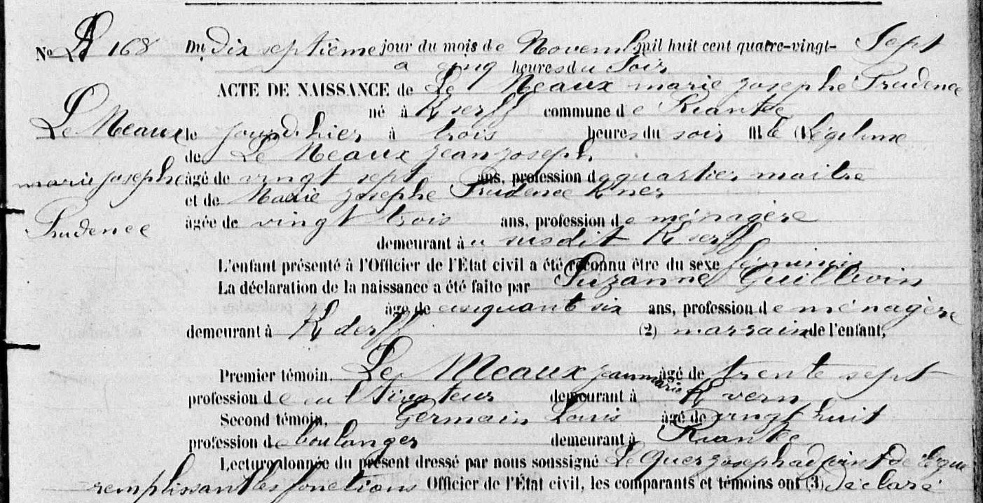 | Elle voit le jour à Riantec (56), Kerderff 16/11/1887. Signature : Y. Père : MEAUX (LE) Jean Joseph, Sosa 22, Deuxième Maître Canonnier - Retraité Naissance : Date : 11/12/1860 Lieu : Kervignac (56), Talhouët Décès : Date : 30/06/1913 Lieu : Riantec (56) à l'âge de 52 ans. Mère : KERNER Marie Josephe Prudence, Ménagère Naissance : Date : 17/12/1864 Lieu : Riantec (56), Kerderff Décès : Date : 17/11/1891 à l'âge de 26 ans. A sa naissance, ses père et mère étaient âgés de 26 ans et 22 ans. |