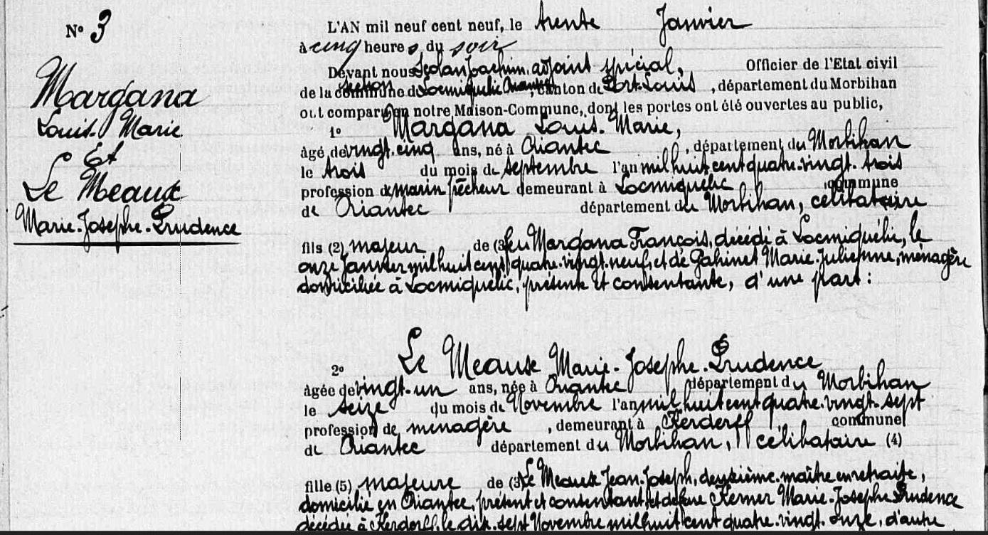 | Mariage MARGANA Louis Marie MEAUX (LE) Marie Josephe Prudence - 1909 - Locmiquélic - 3 |