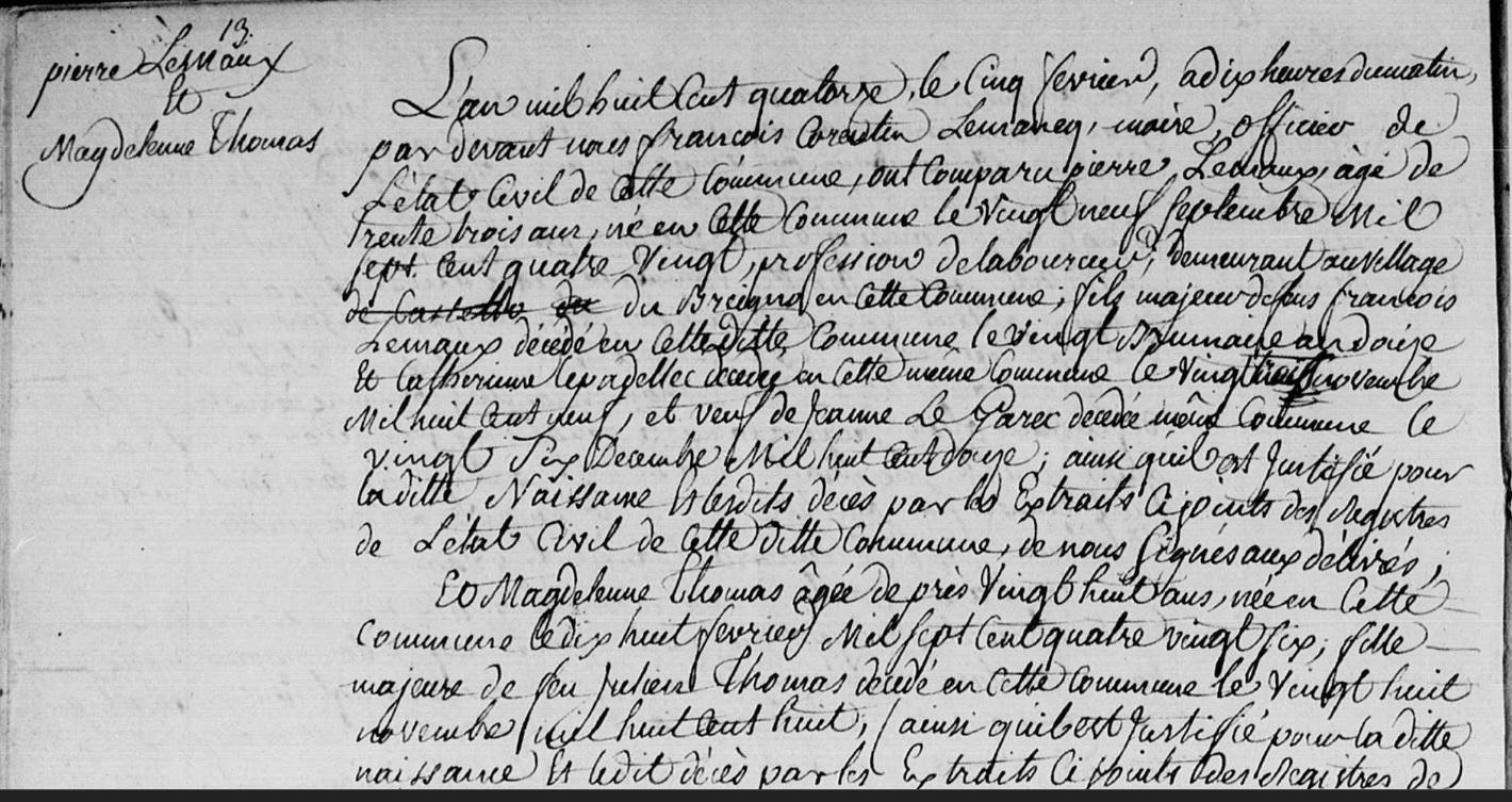 | Mariage MEAUX (LE) Pierre THOMAS Magdeleine - 1814 - Kervignac - 1 |