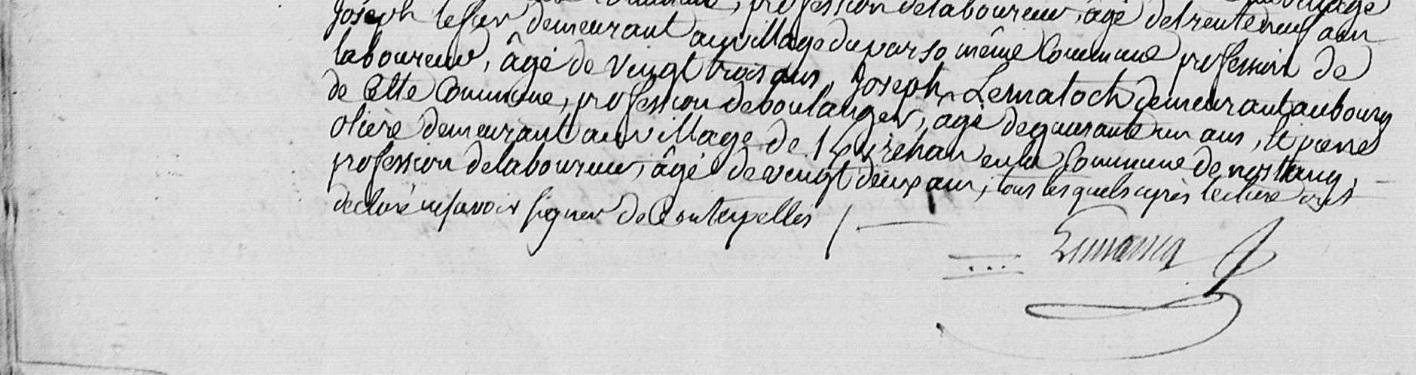 | Il naît 21/04/1768 à Kervignac (56). Père : MEAUX (LE) OU MAU (LE) Ollivier, Sosa 352, Laboureur Naissance : Date : 12/04/1726 Lieu : Kervignac (56), Braigno Décès : Date : 27/04/1798 Lieu : Kervignac (56) à l'âge de 72 ans. Mère : PORTANGUEN Marie, Sosa 353, Laboureuse Naissance : Date : 29/06/1722 Lieu : Kervignac (56), Lothuen Décès : Date : 09/02/1791 Lieu : Kervignac (56) à plus de 68 ans. A sa naissance, ses père et mère étaient âgés de 42 ans et 45 ans. |