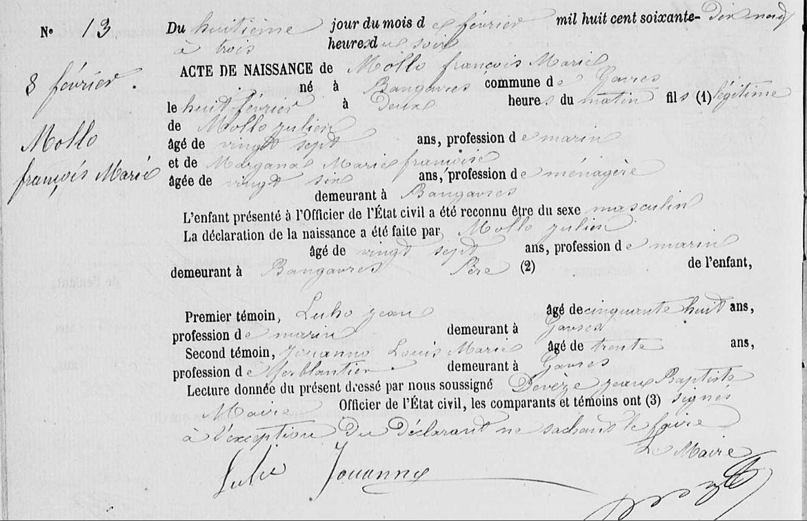 | Il naît à Gâvres (56), Bangâvres 08/02/1879. + 18/02/1879 Gâvres (56), Bangâvres, 10 jours - - 20:00 - NO à l'âge de 10 jours. Père : MOLLO Julien, Marin pêcheur Naissance : Date : 24/07/1852 Lieu : Riantec (56), Gâvres Décès : Date : 03/08/1895 à moins de 43 ans. Mère : MARGANA Marie Françoise, Cultivatrice - Ménagère Naissance : Date : 25/11/1852 Lieu : Riantec (56), Bourg Décès : Date : 15/11/1904 Lieu : Port-Louis (56), Hospice civil de la commune à l'âge de 51 ans. A sa naissance, ses père et mère étaient tous deux âgés de 26 ans. |