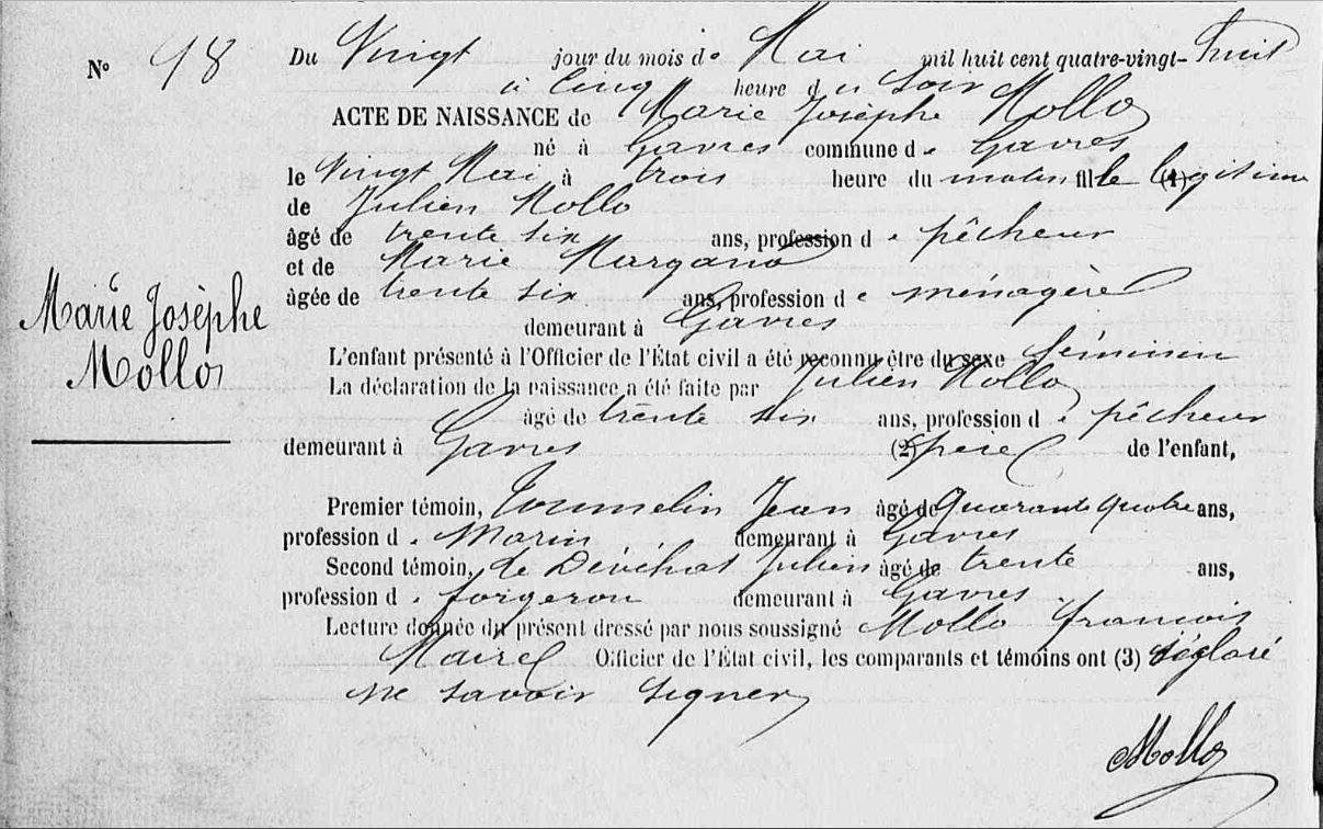 | Elle est née 20/05/1888 à Gâvres (56), Bourg. Père : MOLLO Julien, Marin pêcheur Naissance : Date : 24/07/1852 Lieu : Riantec (56), Gâvres Décès : Date : 03/08/1895 à moins de 43 ans. Mère : MARGANA Marie Françoise, Cultivatrice - Ménagère Naissance : Date : 25/11/1852 Lieu : Riantec (56), Bourg Décès : Date : 15/11/1904 Lieu : Port-Louis (56), Hospice civil de la commune à l'âge de 51 ans. A sa naissance, ses père et mère étaient tous deux âgés de 35 ans. |