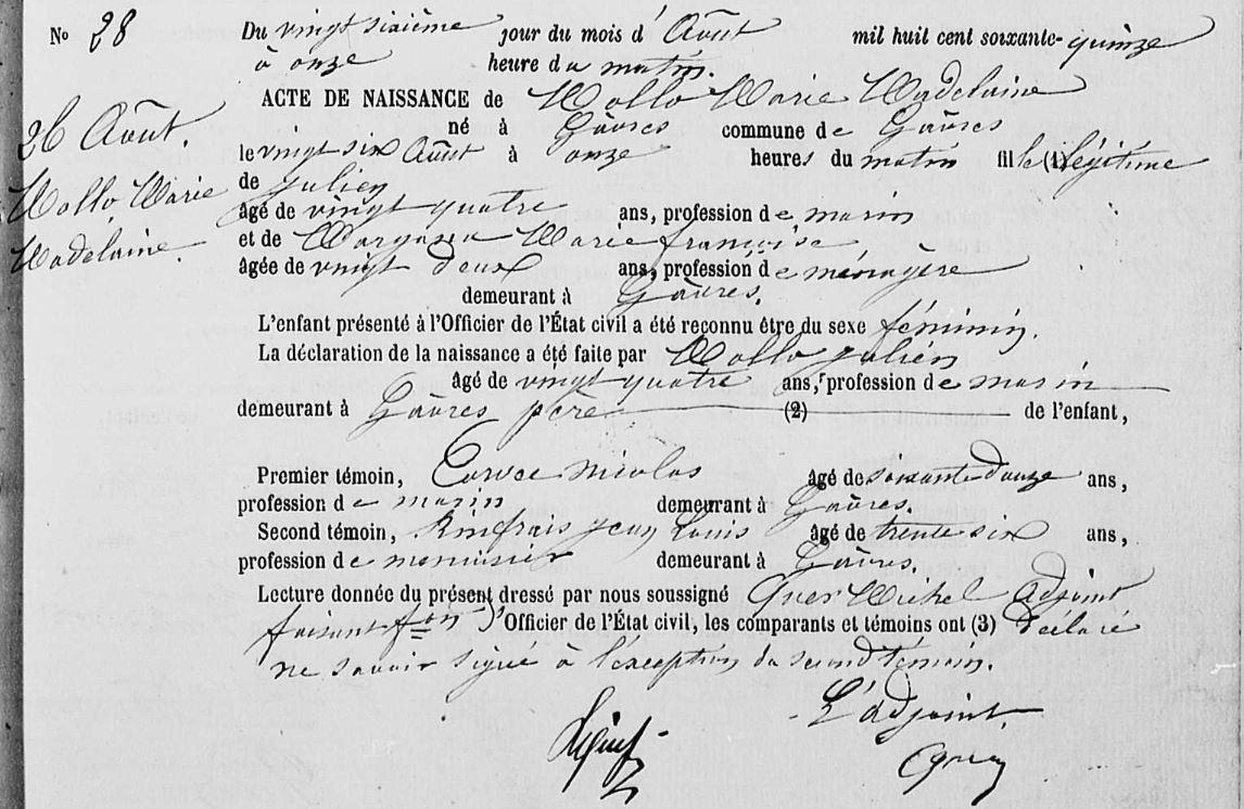 | Naissance MOLLO Marie Madeleine - 1875 - Gâvres |