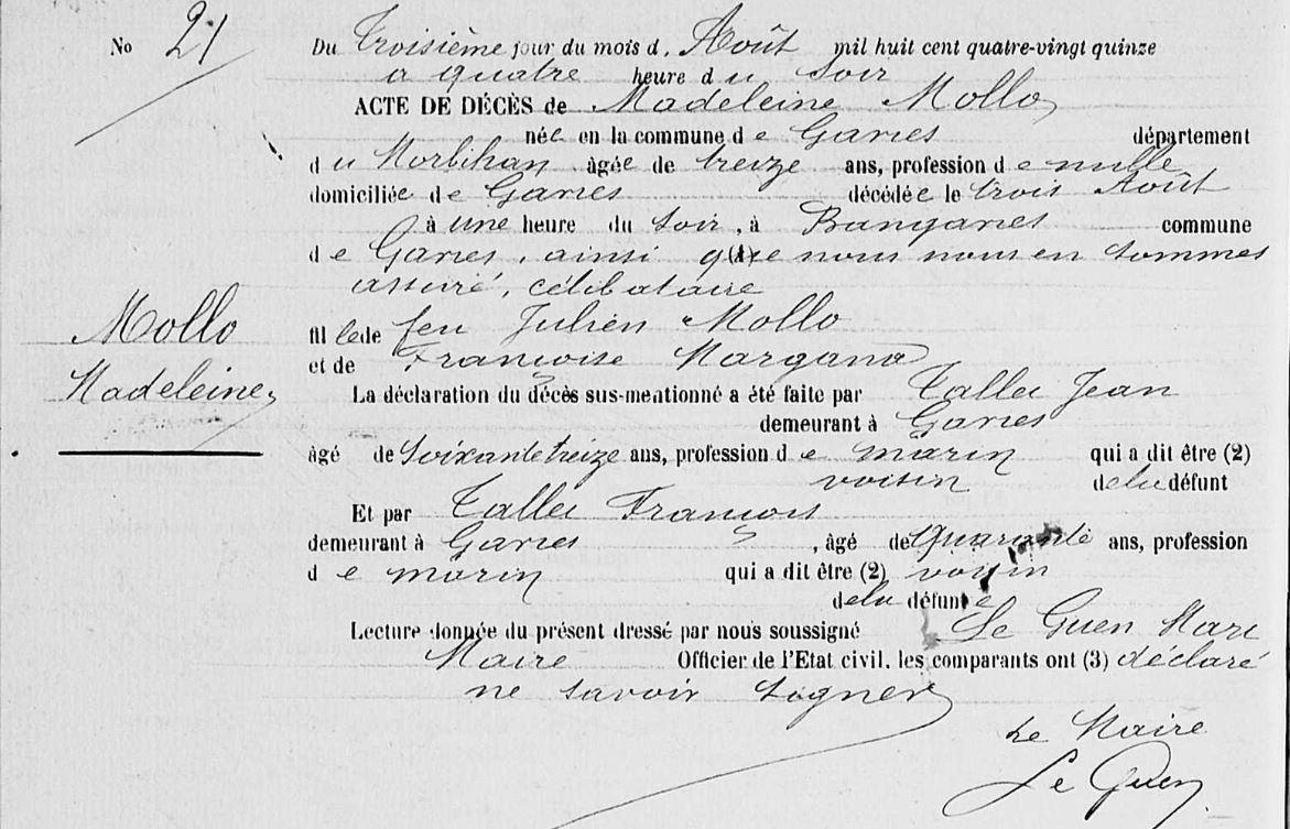 Décès MOLLO Marie Madeleine - 1895 - Gâvres |