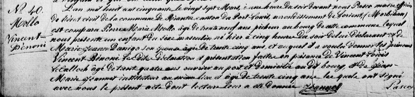 | Naissance MOLLO Vincent Bénoni - 1850 - Riantec |