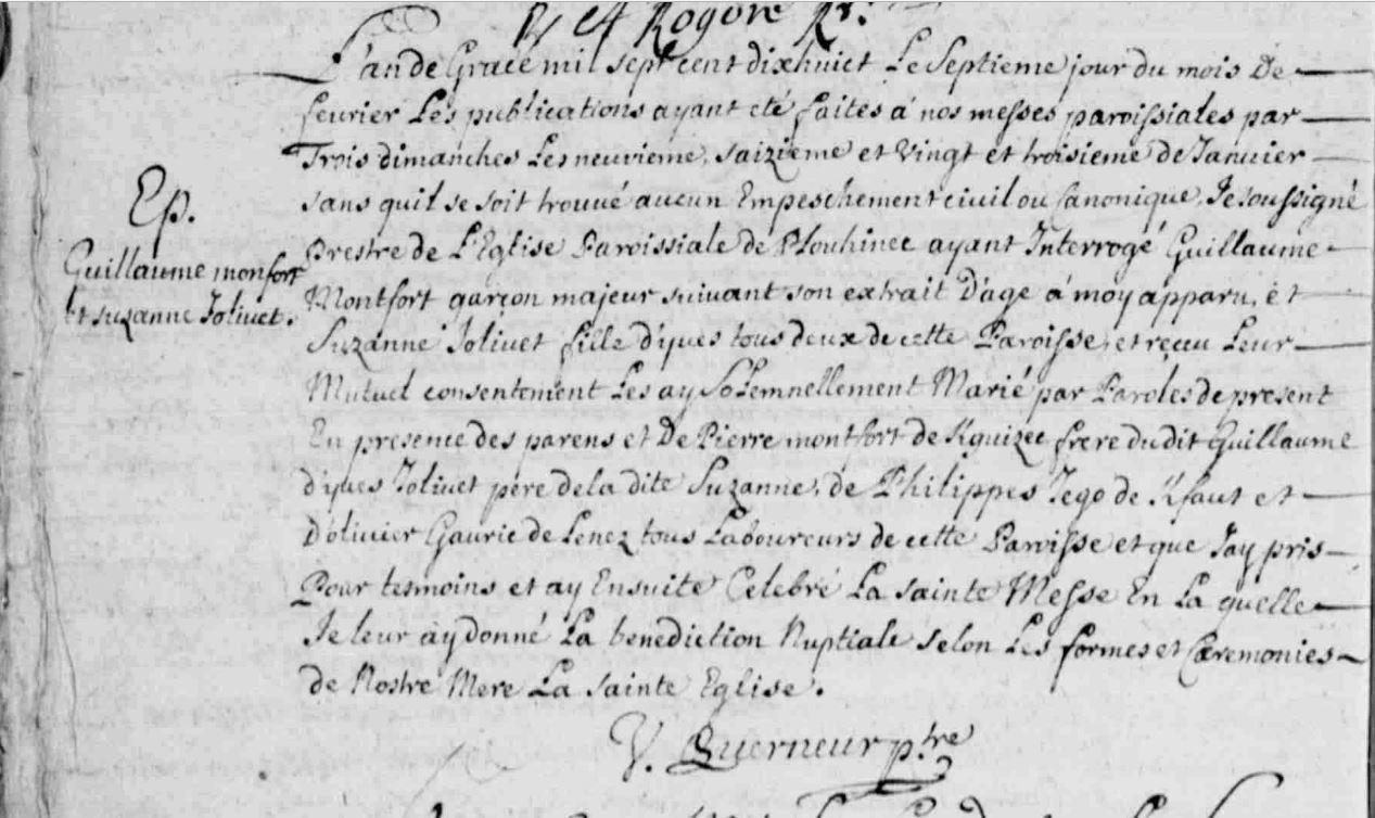 | Mariage MONFORT Guillaume JOLIVET Suzanne - 1719 - Plouhinec |