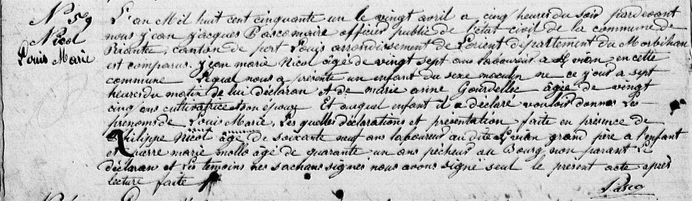| Il voit le jour à Riantec (56), Kervihan 20/04/1851. Signature : Y. Père : NICOL Jean Marie, Sosa 56, Cultivateur - Marin pêcheur Naissance : Date : 08/08/1822 Lieu : Riantec (56) Décès : Date : 12/06/1871 Lieu : Riantec (56), Kervihan à l'âge de 48 ans. Mère : GOURDELLEC (LE) Jacquette Marie Anne, Sosa 57, Ménagère - Cultivatrice Naissance : 1 Date : 19/03/1826 Lieu : Merlevenez (56) Décès : Date : 20/11/1890 Lieu : Riantec (56), Kervihan à l'âge de 64 ans. A sa naissance, ses père et mère étaient âgés de 28 ans et 25 ans. |