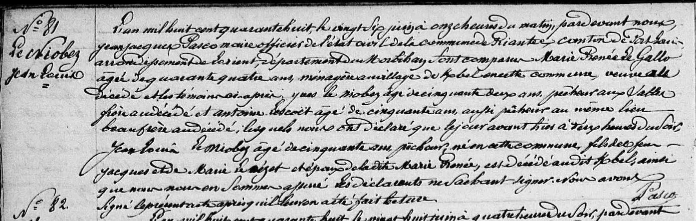 | 2. NIOBE Jean Louis Naissance : Date : ../../1800 Uni avec GALLO (LE) Marie Renée. Décès : Date : 24/06/1848 Lieu : Riantec (56), Kerbel à environ 48 ans. |
