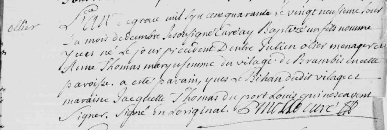 | Baptême OLLIER Yves - 1740 - Riantec |