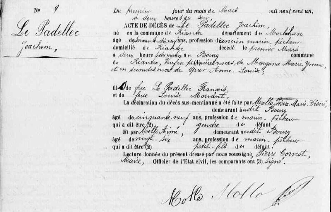 Décès PADELLEC (LE) Joachim - 1901 - Riantec |