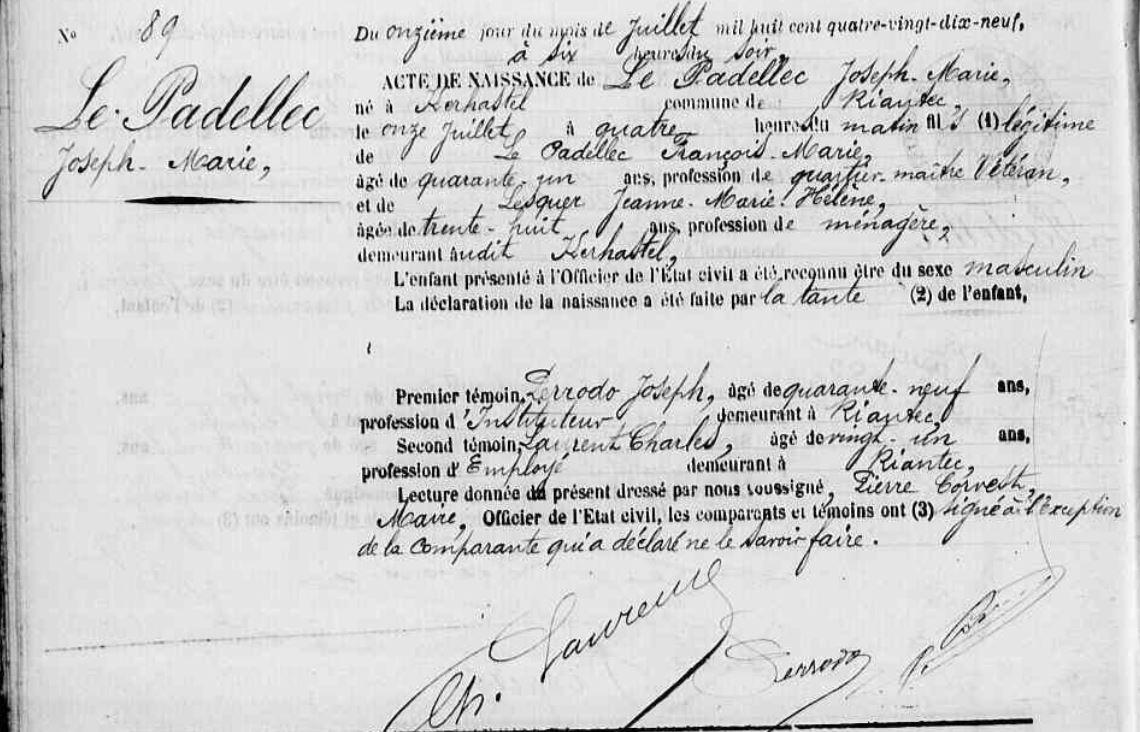| Naissance PADELLEC (LE) Joseph Marie - 1899 - Riantec |
