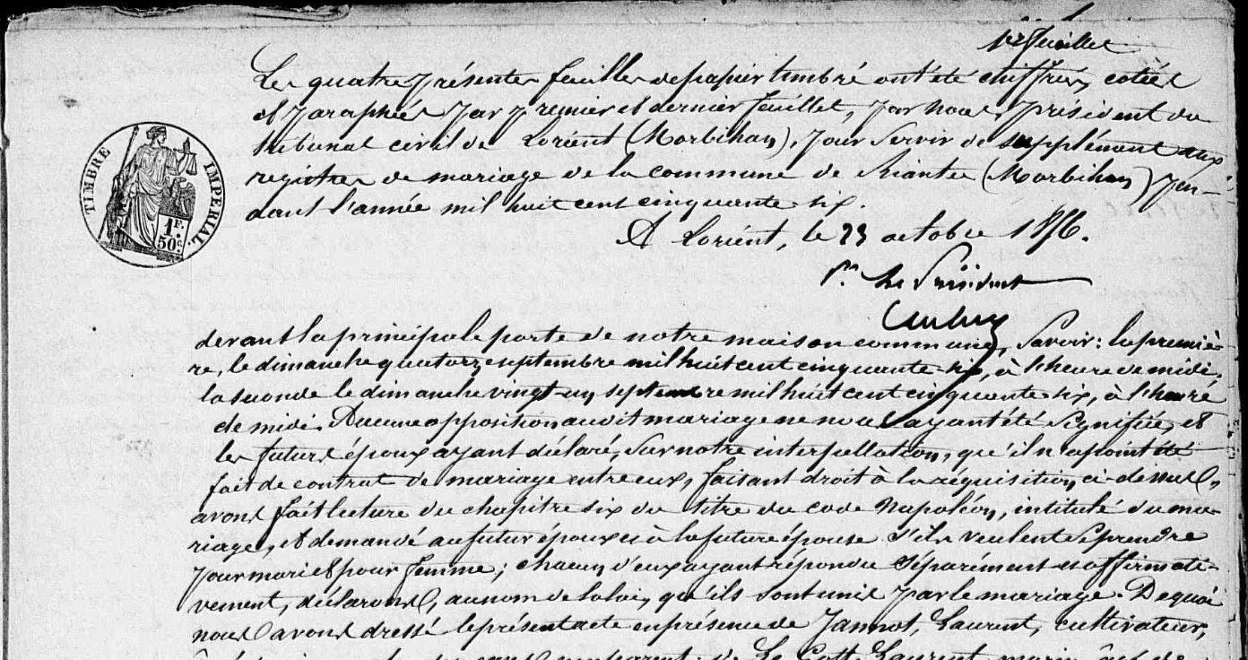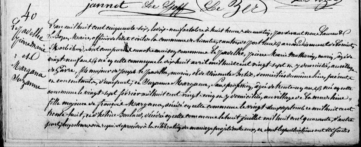 | Mariage PADELLEC (LE) Pierre Marie MARGANA Suzanne - 1856 - Riantec - 1 |