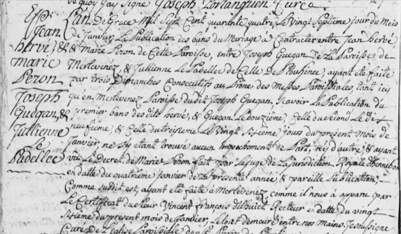 | Fiancailles HERVE Jean PERON Marie - 1744 - Plouhinec |
