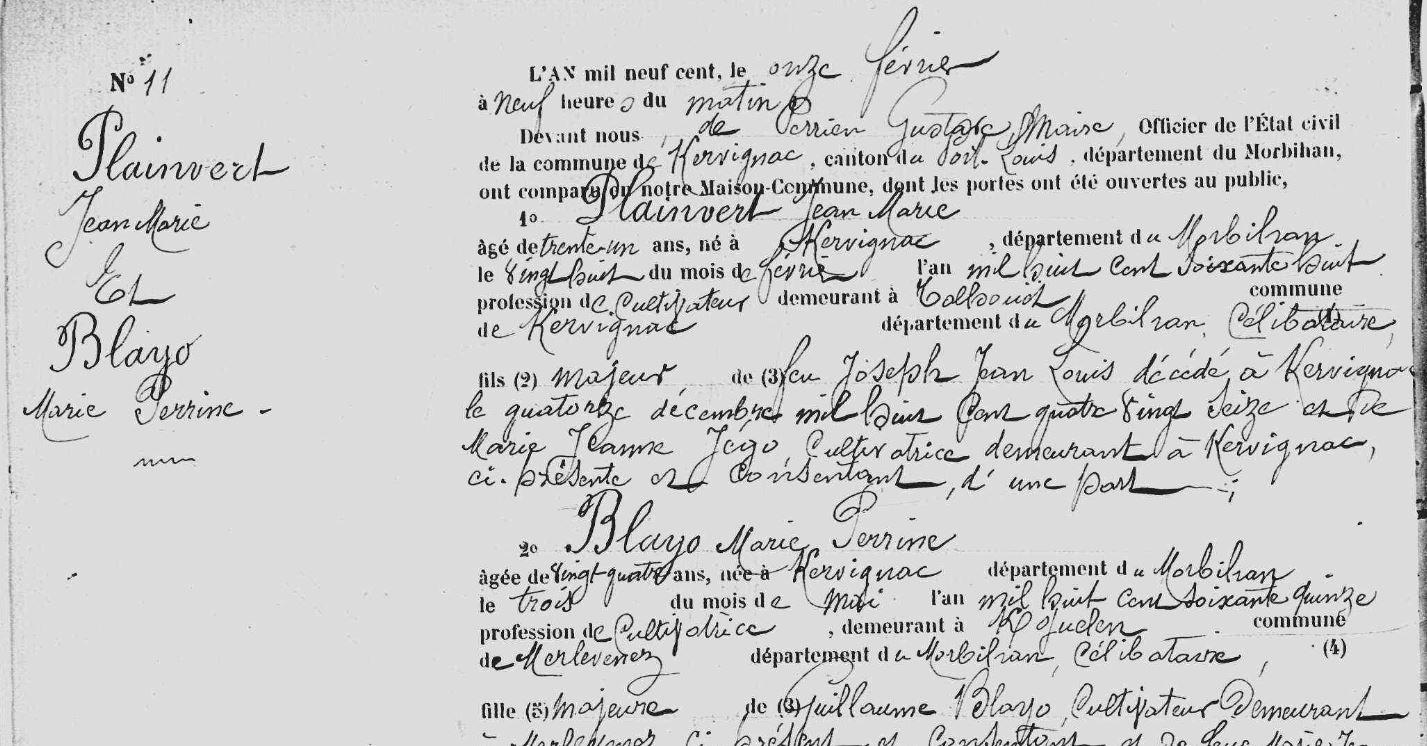 Mariage PLAINVERT Jean Marie BLAYO Marie Perrine - 1900 - Kervignac - 1 |