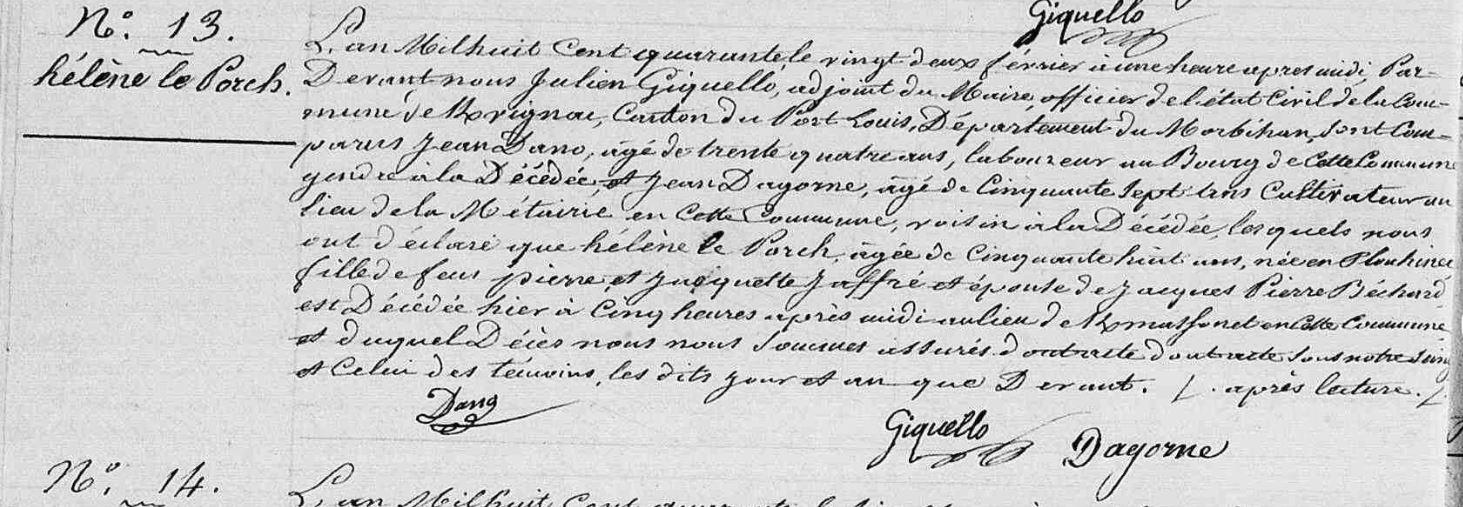 | Enfant(s) de GALLO (LE) Jacques et de PORT (LE) Marie : - GALLO (LE) Marie Jacquette (Naissance : 1817 Décès : 1878) Union 1839 : JOUANNO Joseph - GALLO (LE) Marie Hélène (Naissance : 1818 Décès : 1849) Union 1844 : CALLOCH (LE) Vincent - GALLO (LE) Martin, Sosa 42 (Naissance : 1820 Décès : 1871) Union 1844 : GOFF (LE) Marie |