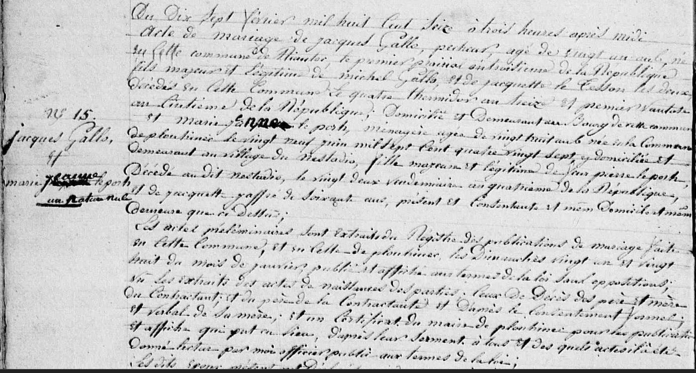 | Mariage : Date : 17/02/1816 Lieu : Riantec (56) GALLO (LE) Jacques, Sosa 84, Marin pêcheur Il est né à Riantec (56) 19/05/1795. + 24/08/1837 Riantec (56), - - - NO à l'âge de 42 ans 2. |