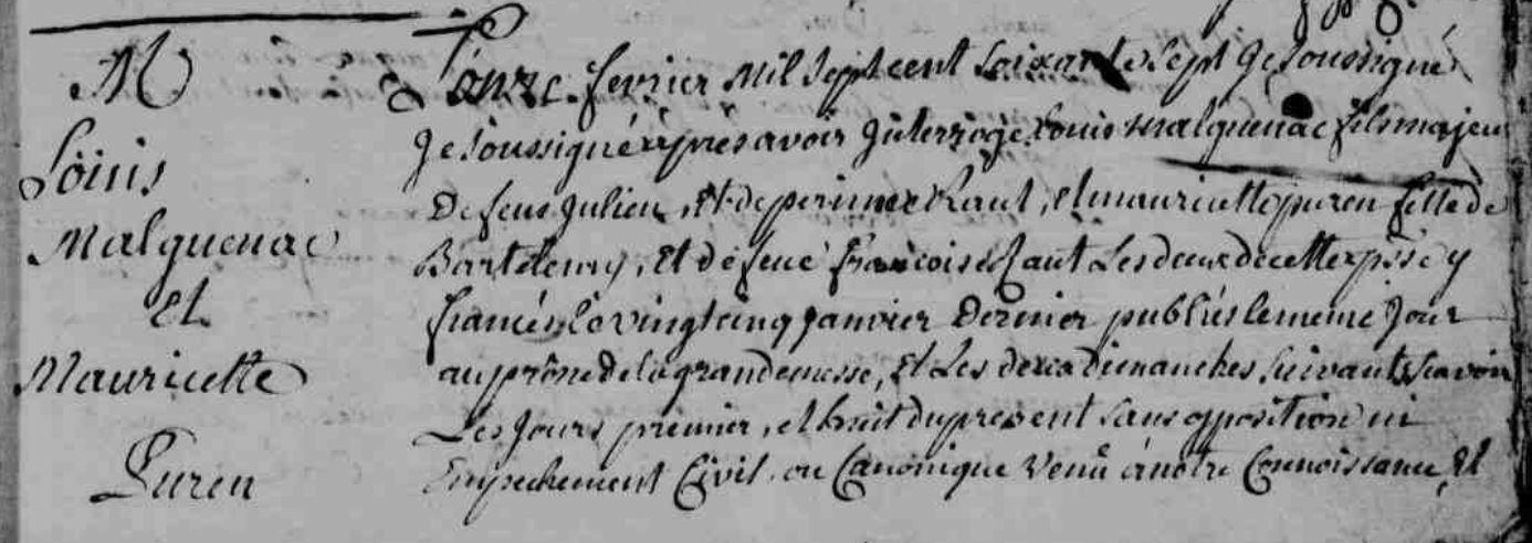 | Mariage : Date : 11/02/1767 Lieu : Baud (56) MALGUENAC Louis, Boisier Il naît 23/02/1737 à Baud (56), Lambel Baud. + 23/02/1778 Baud (56), Bois de Quinipily, - - - NO à l'âge de 41 ans 1. |